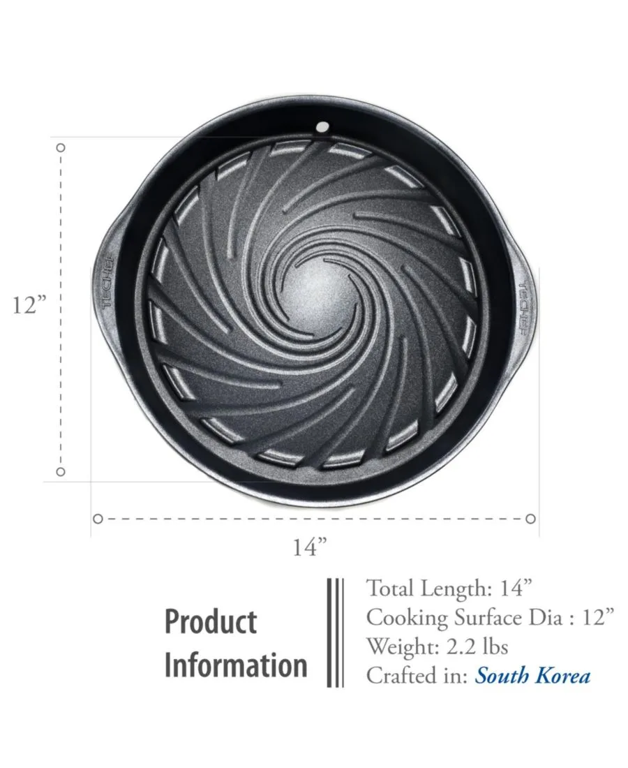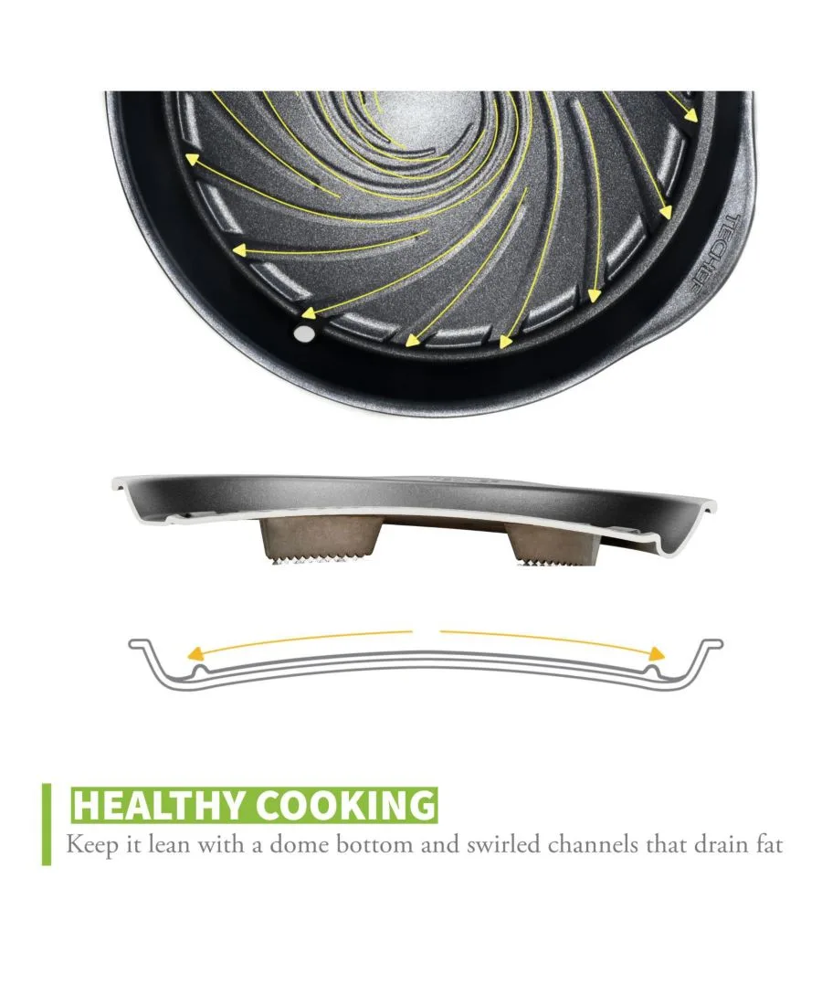 Сковорода-гриль TECHEF в корейском стиле - это инновационный инструмент для приготовления любых видов мяса, рыбы и овощей на гриле. Она станет прекрасным и увлекательным способом устроить барбекю-вечеринку. Уникальная спиральная канавка и куполообразная форма дна способствуют медленному стеканию масла, придавая блюдам более насыщенный вкус. Сковорода изготовлена с использованием многослойного антипригарного покрытия, нанесенного по технологии Print Design - инновационному и безопасному методу нанесения цвета и рисунков без использования вредных внешних красок. Это идеальный инструмент для низкожировой диеты, помогающий контролировать потребление жиров, холестерина, углеводов и калорий.