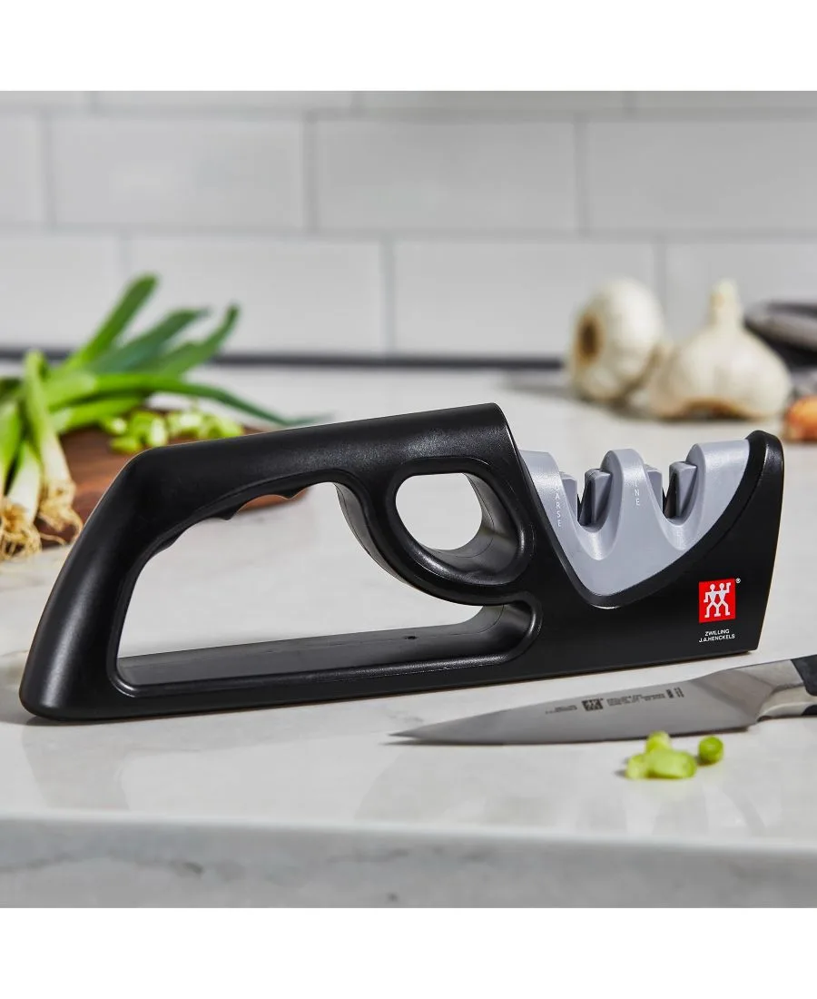 Легко и безопасно поддерживайте остроту ваших ножей с помощью двухступенчатой точилки для ножей. Керамические стержни с крупной и мелкой зернистостью заточат даже самый тупой нож всего за несколько движений. Подходит для всех ножей западного типа. Быстро и безопасно затачивает ваши лезвия.