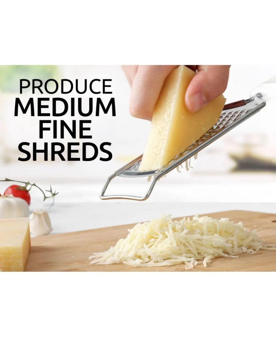 Изготовленная из высококачественной нержавеющей стали 18/10, эта терка для сыра имеет прочный и надежный каркас, способный выдерживать давление, не деформируясь. Помимо сыра, эту небольшую терку можно использовать для имбиря, чеснока, мускатного ореха, шоколада, цитрусовых, масла и овощей, таких как морковь, картофель, цуккини и многое другое. Наша терка для пармезана оснащена острыми лезвиями из нержавеющей стали, позволяющими без труда натереть мелкий сыр. Добавьте немного аромата в салат, пиццу, пасту, суп или используйте ее в качестве терки для цитрусовых, чтобы придать вашим рецептам пикантную нотку. Наша ручная терка для сыра имеет мягкую ручку из термопластичной резины для нескользящего и удобного захвата. Приподнятый каркас позволяет установить ее на твердой поверхности для большего контроля.