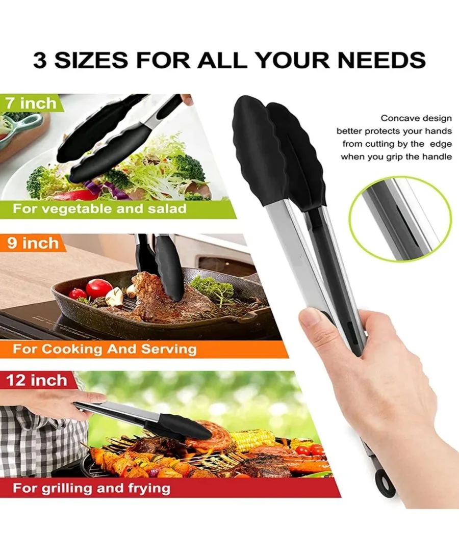 Этот набор кухонных щипцов включает 3 размера: маленький (18 см), средний (23 см) и большой (30 см), что делает его идеальным для выполнения основных кухонных задач. Вы можете использовать его для жарки кукурузы, переворачивания бургеров, приготовления салатов, нарезки жареного филе или просто как инструмент для барбекю. Он также станет отличным подарком для семьи и друзей.