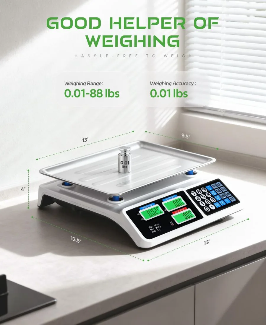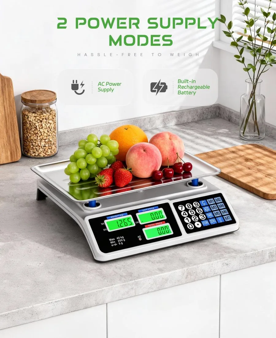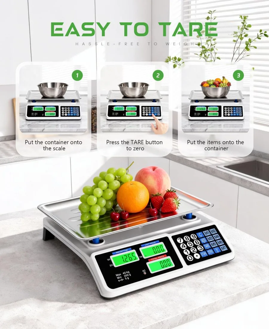 Высокоточная работа: Оснащен усовершенствованными датчиками для точных и стабильных показаний веса. Сохраняет до 8 цен за единицу товара, что упрощает расчеты и повышает скорость обслуживания на кассе в оживленных торговых центрах. Двойной ЖК-дисплей: Имеет четкие двойные ЖК-экраны для удобства продавца и покупателя, способствуя прозрачности ценообразования и повышая доверие. Легко читаемые цифровые дисплеи обеспечивают более плавные и профессиональные транзакции. Быстрое преобразование единиц измерения: Легко переключайтесь между фунтами и килограммами, чтобы удовлетворить различные потребности розничной торговли. Прочная конструкция и качественные материалы обеспечивают длительную работу даже при частом ежедневном использовании. Водонепроницаемая платформа из нержавеющей стали: Разработана с водонепроницаемой поверхностью для взвешивания из нержавеющей стали для легкой очистки и повышения гигиены. Идеально подходит для овощных прилавков, продуктовых магазинов, гастрономических отделов и других предприятий розничной торговли продуктами питания. Автоматическая блокировка показаний: Автоматически блокирует показания веса после стабилизации, чтобы предотвратить ошибки, связанные с колебаниями, и ускорить транзакции. Предупреждение: Устанавливайте на устойчивую, ровную поверхность и избегайте перегрузки сверх номинальной грузоподъемности. Импортный товар