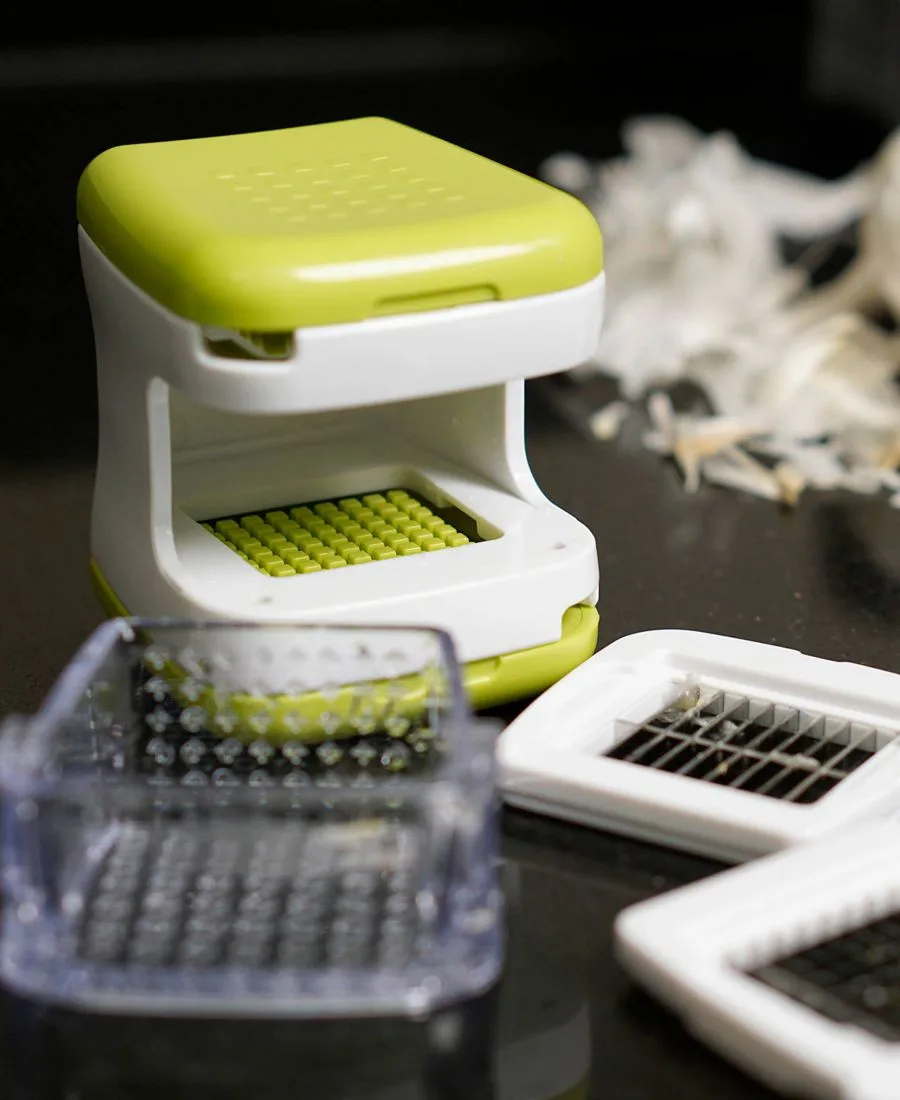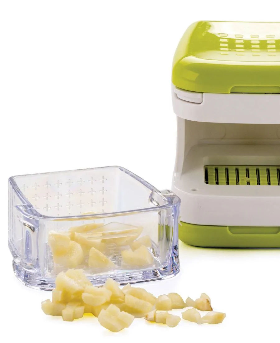 Наш кубик для измельчения чеснока мелко нарезает и аккуратно выкладывает очищенный чеснок в прозрачный контейнер. Просто откройте зеленую крышку для измельчения, выровняйте контейнер или переверните кубик и контейнер для нарезки. Детали легко снимаются для мытья в посудомоечной машине. Размеры кубика примерно 8 x 8 x 8 см.