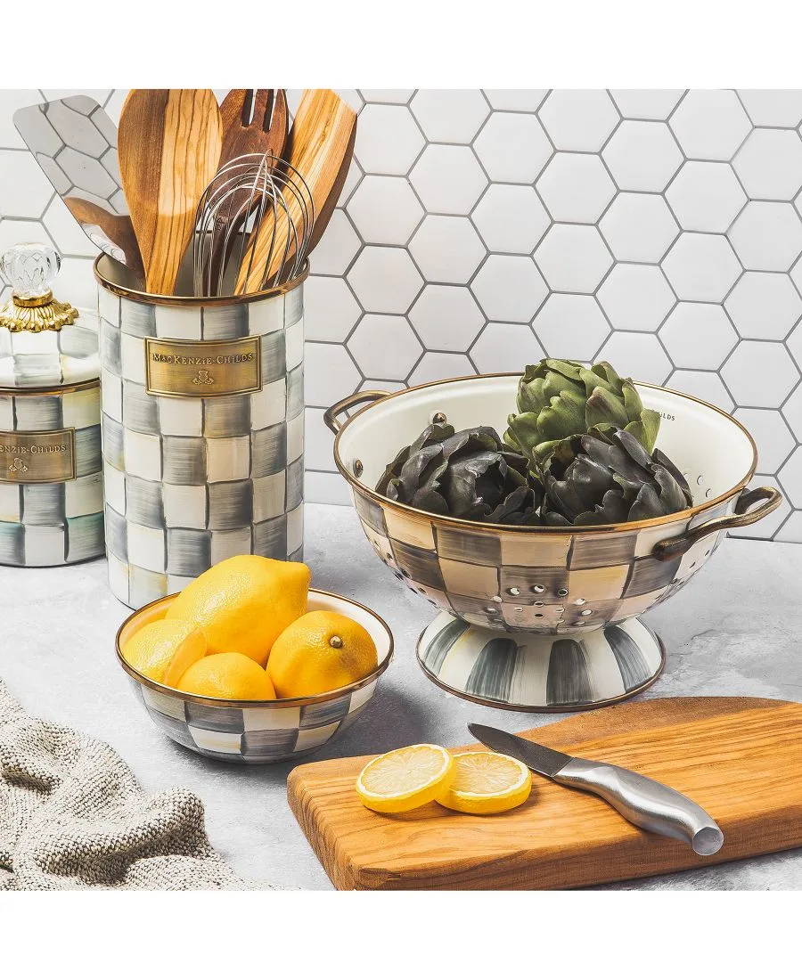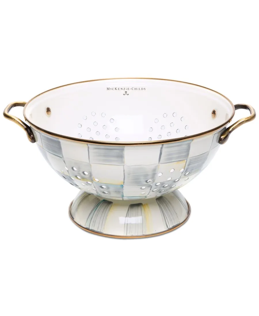 Этот красивый дуршлаг от Mackenzie-Childs, который не бросится прятать в шкафу, сочетает в себе прочность эмалированной стали и расписанный вручную клетчатый узор.