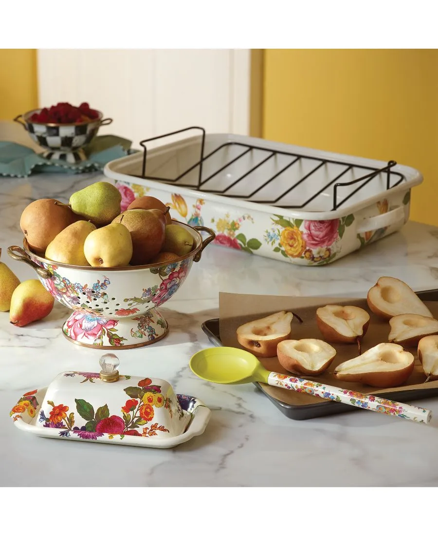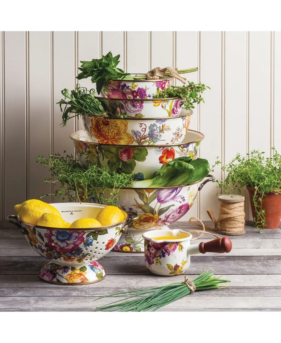 Практичный и красивый дуршлаг из коллекции Mackenzie-Childs Flower Market. Его гладкая эмалированная сталь украшена яркими растительными мотивами, что придает ему стильный вид на долгие годы.