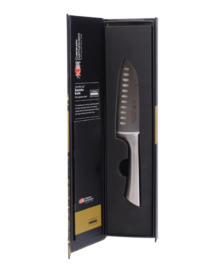 Нож Cuisine::pro Damashiro Santoku (14 см или 14 см) гарантированно обеспечит вам максимально удобное и быстрое измельчение. Низкий кончик и широкое лезвие делают этот нож лучшим помощником повара для нарезки ломтиками, кубиками и рубки.