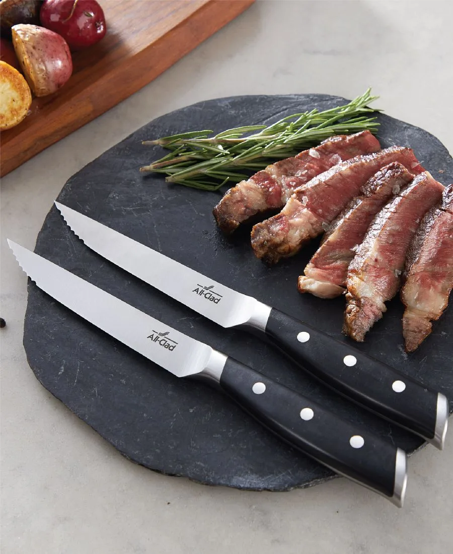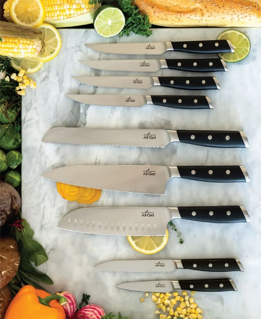 Кованые ножи All-Clad идеально сочетают в себе мастерство изготовления и функциональность. Полностью кованая конструкция включает в себя лезвия из немецкой нержавеющей стали, оптимизированные криогенной обработкой для повышения производительности, долговечности и коррозионной стойкости. Режущая кромка с углом заточки 26 градусов обеспечивает исключительную точность резки без сколов - она не только остается острой с самого начала, но и сохраняет остроту надолго. Исключение составляют ножи для хлеба, универсальные ножи и ножи для стейка, у которых угол заточки составляет 18 градусов.