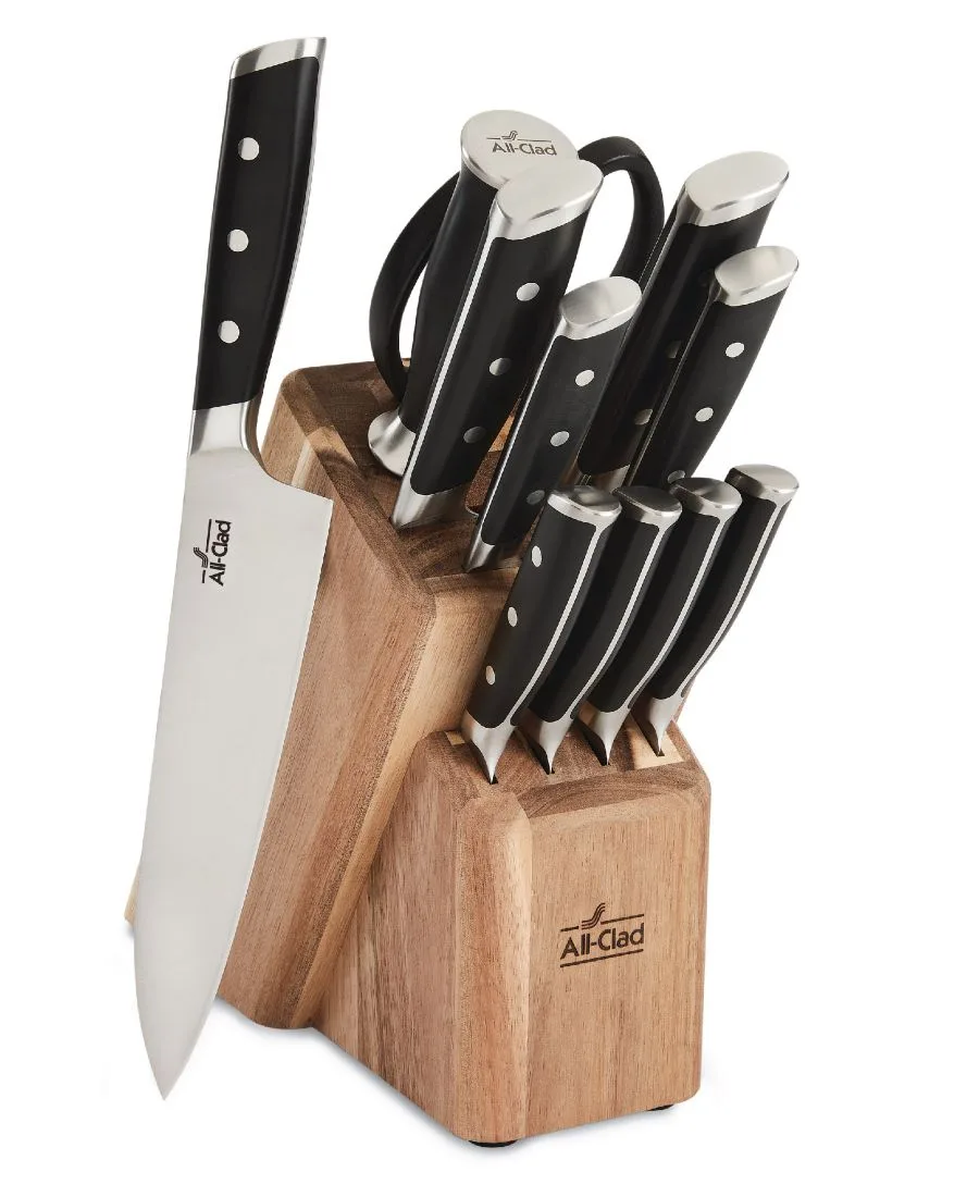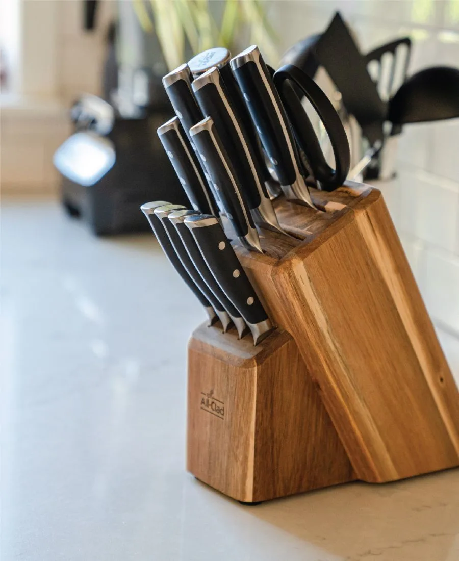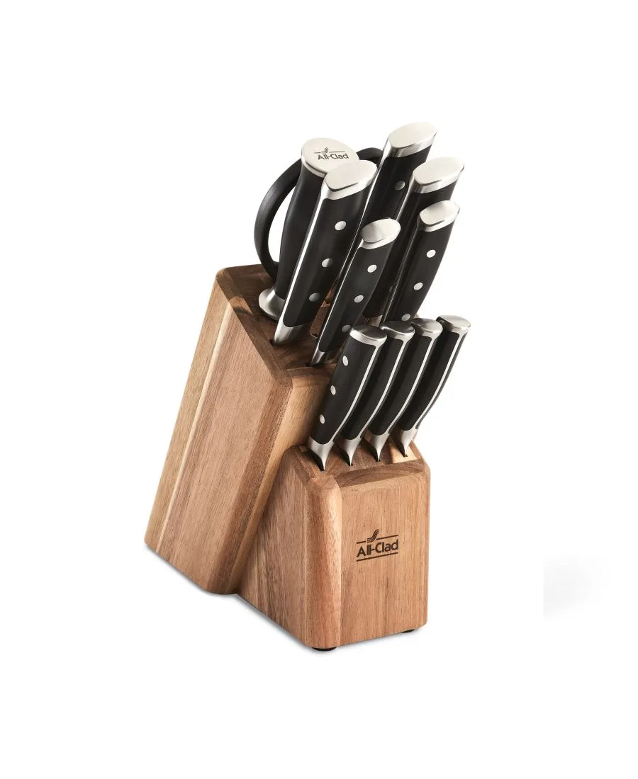 Острый с самого начала, острый до конца: кованые ножи All-Clad получили наивысшую оценку за режущие характеристики по сравнению с 8 ведущими брендами на рынке. Полностью кованая немецкая нержавеющая сталь: устойчивая к ржавчине нержавеющая сталь X50CrMoV15 для оптимальной долговечности и надежности. Криозакаленные лезвия: закалены жидким азотом для повышения устойчивости к ржавчине и сохранения остроты. Экспертная точность: общая режущая кромка под углом 26 градусов достаточно остра для нарезки тончайшими ломтиками, но при этом достаточно прочна, чтобы противостоять сколам. Комфорт и контроль: устойчивая к выцветанию рукоятка из полиоксиметилена с тройным заклепочным креплением имеет цельный хвостовик и угловой упор на конце, удобно подходящий для всех типов хвата. Уход за качеством: ручная мойка в теплой воде и сушка после каждого использования. В комплекте: 1 подставка из акации, 4 ножа для стейка 13 см, поварской нож 1 фут 20 см. Нож, 1 - 20 см хлебный нож, 1 - 18 см нож Сантоку, 1 - 5-дюймовый универсальный нож, 1 - 3,5-дюймовый нож для чистки овощей, 1 - ножницы, 1 - точильный брусок. «Разработано в Канонсбурге, штат Пенсильвания, США, произведено в Китае и имеет ограниченную пожизненную гарантию All-Clad». Нержавеющая сталь. Ручная мойка. Импортный товар.