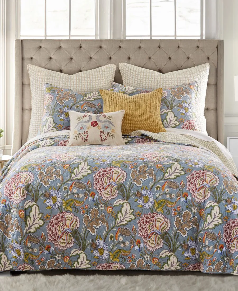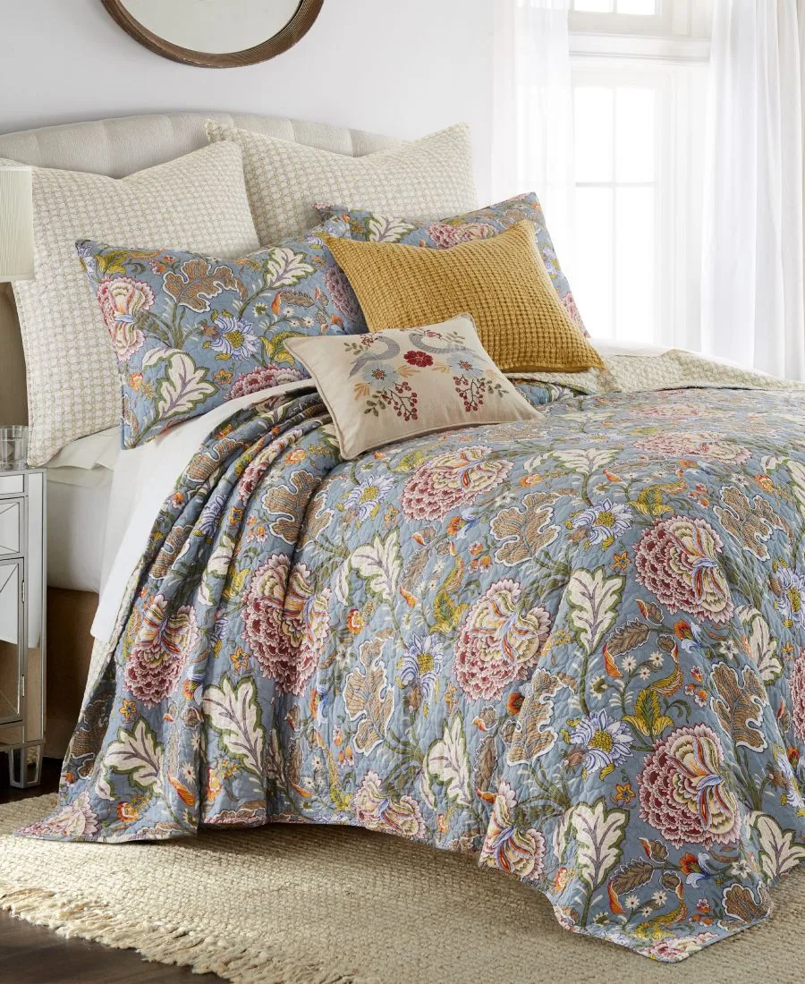 Двустороннее покрывало Angelica от Levtex Home вдохновлено старинными европейскими обоями и гобеленами. Оно украшено классическим цветочным принтом эпохи Якова I и имеет двустороннюю обратную сторону с узором в виде решетки. Наше покрывало имеет большой размер и изготовлено из мягкого и роскошного хлопка, обеспечивая максимальный комфорт и невероятно приятную на ощупь текстуру.