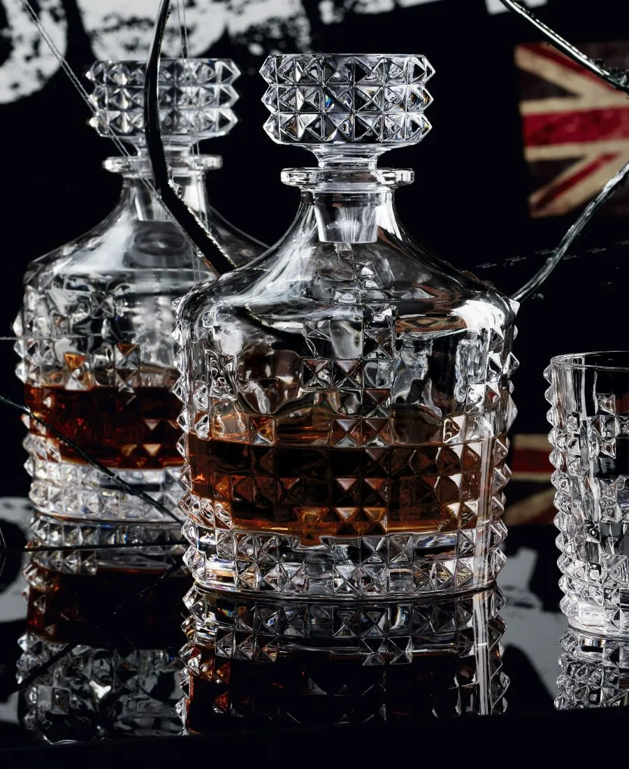 Для оптимального раскрытия вкуса виски или изысканного бренди используйте этот графин для виски в стиле панк. Классические символы панка, такие как заклепки и решетки, находят отражение в формах и поверхностях барных бокалов и графинов, позволяя дизайнеру разрушить классический образ хрусталя своим панковским стилем.