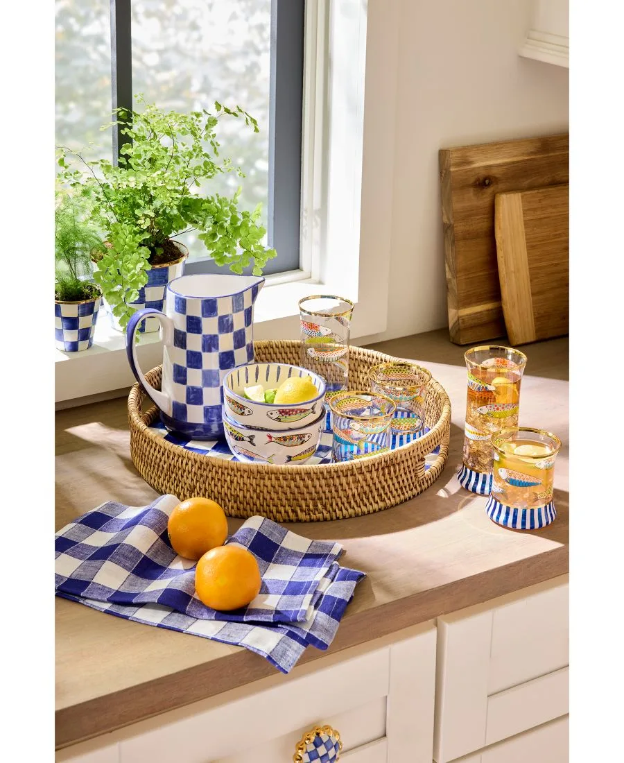 В этой вариации на культовый клетчатый узор Mackenzie-Childs, этот стильный кувшин украшен клетчатым рисунком насыщенного индиго.