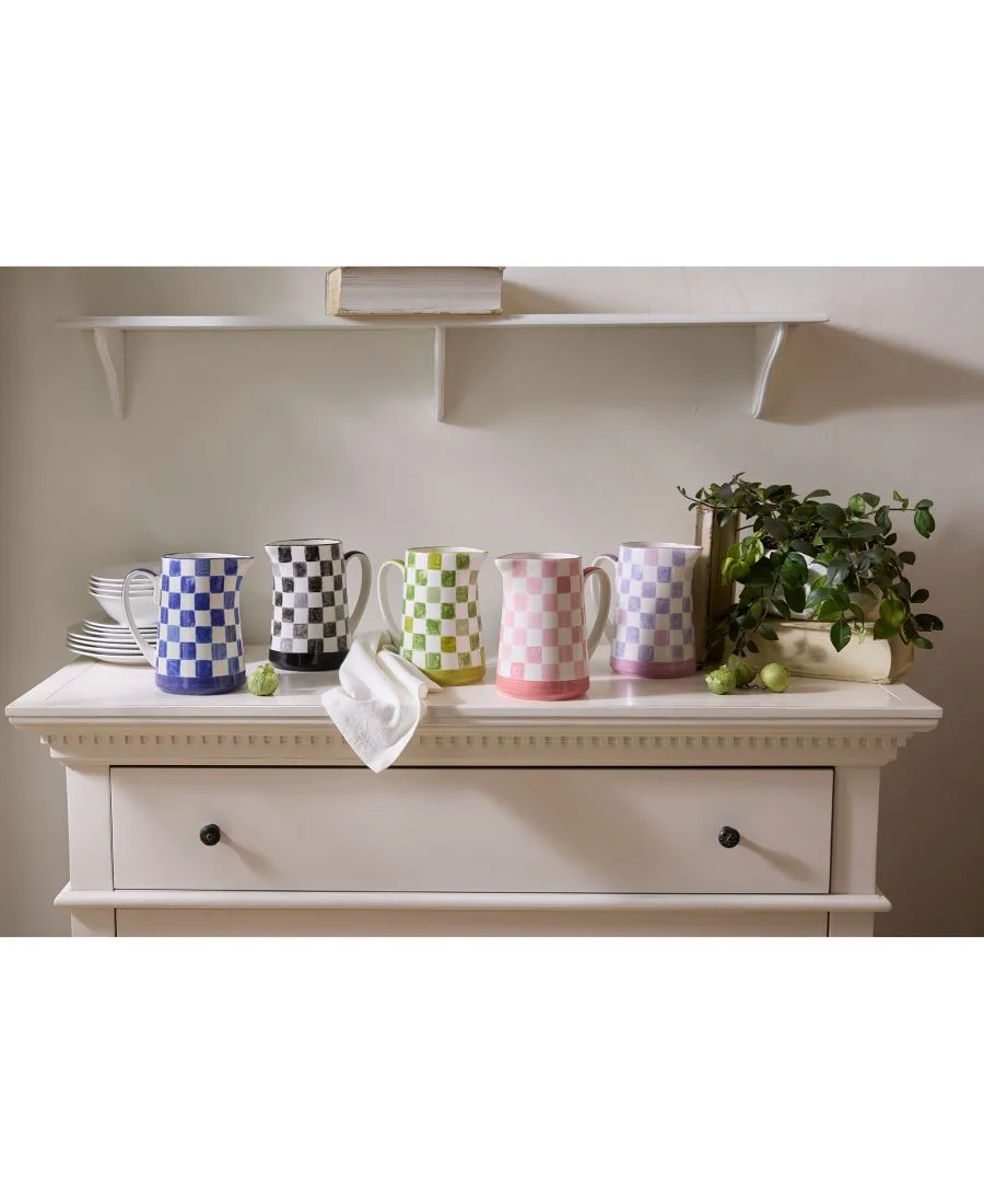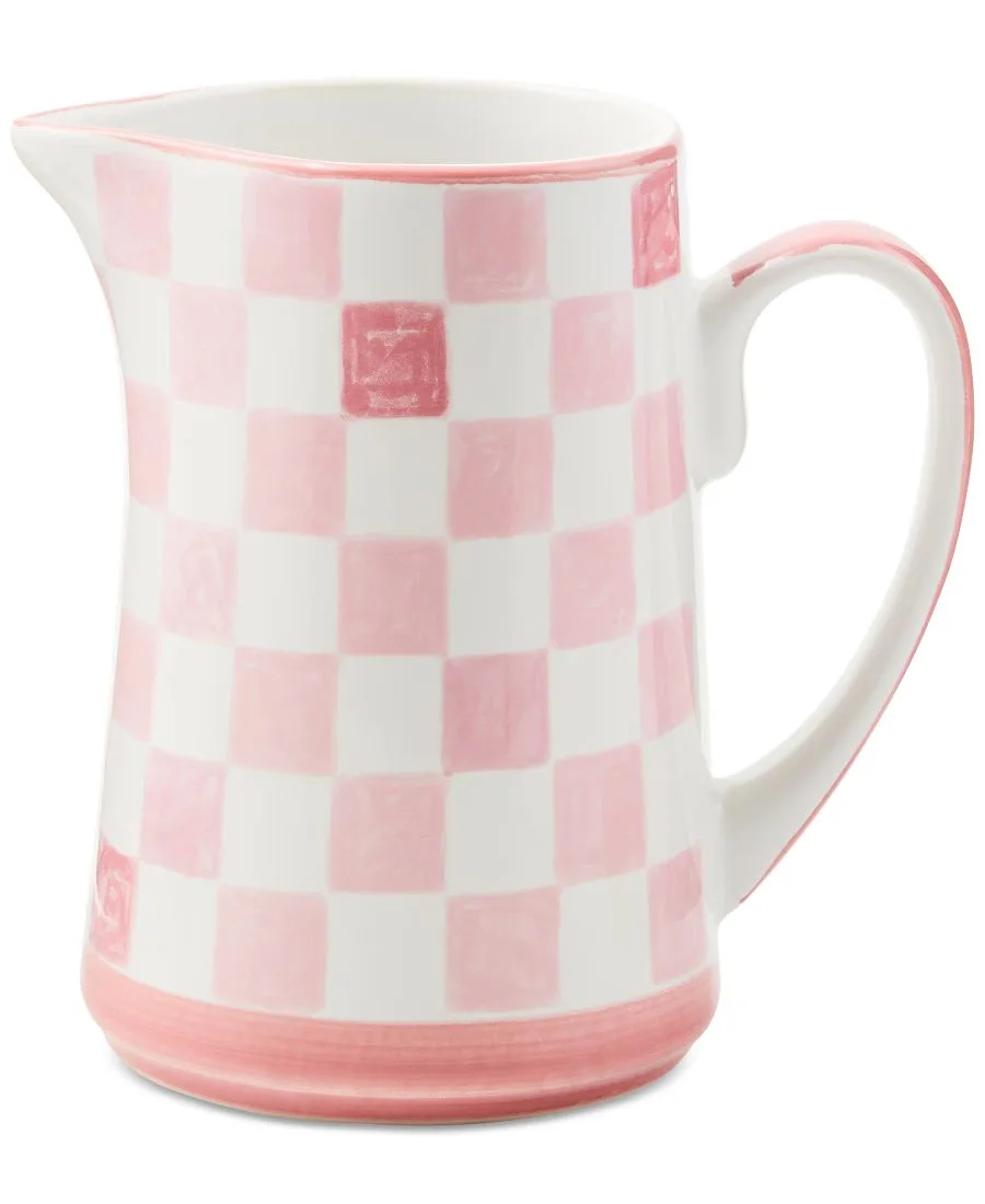 В этой вариации на тему культового клетчатого узора Mackenzie-Childs, этот стильный кувшин украшен жизнерадостными розовыми клетками.