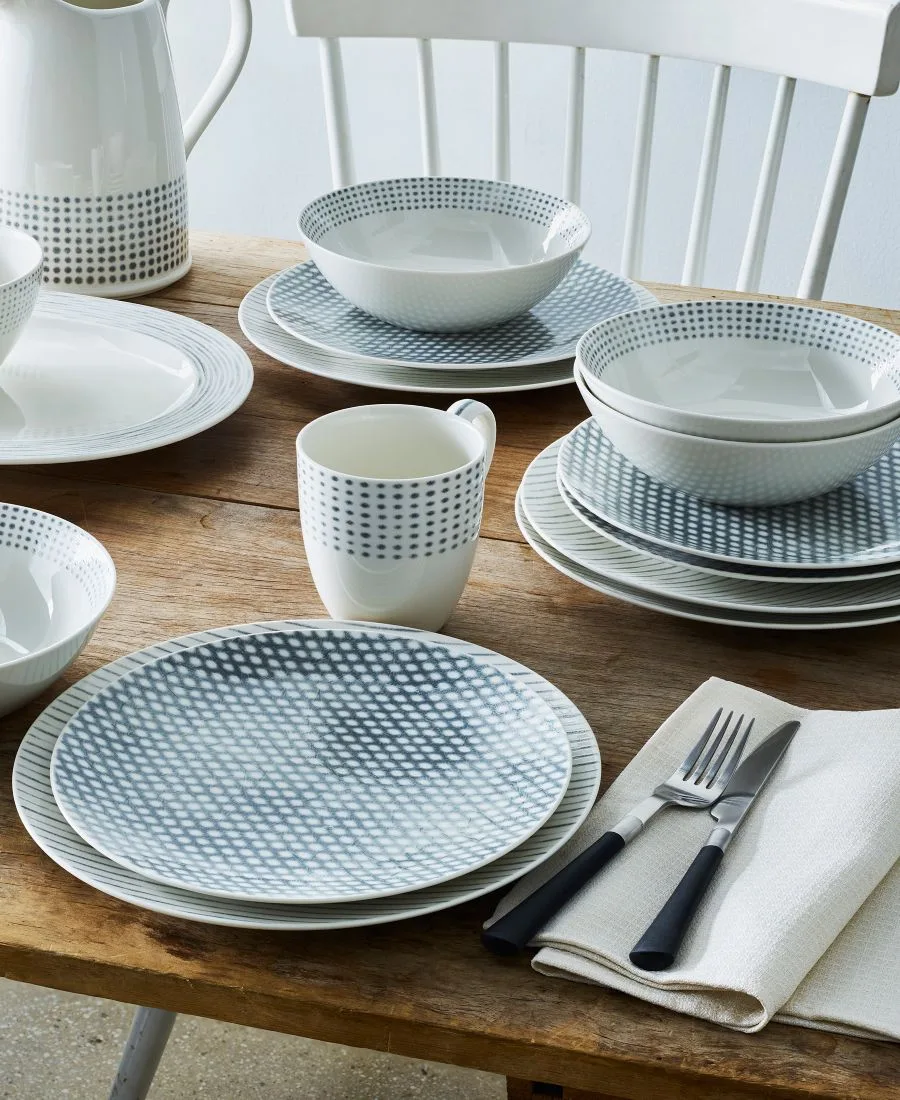 Разнообразные мотивы украшают столовую посуду Hammock от Noritake, изготовленную из фарфора, пригодного для мытья в посудомоечной машине и использования в микроволновой печи. В каждом изделии использованы точки, полосы и другие узоры и визуальные текстуры, представленные в различных вариациях, что придает этой оригинальной коллекции для повседневной сервировки стола смешанный и гармоничный вид, сочетающий в себе свежий и современный стиль.