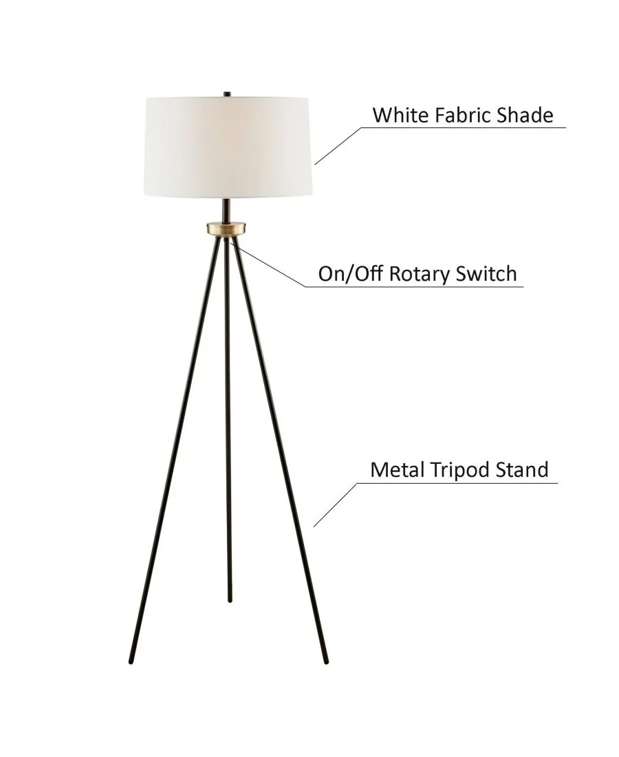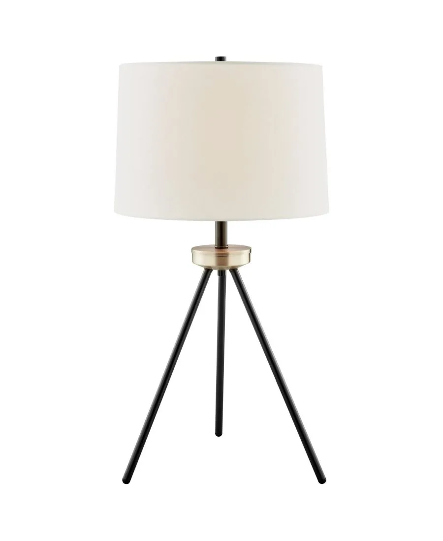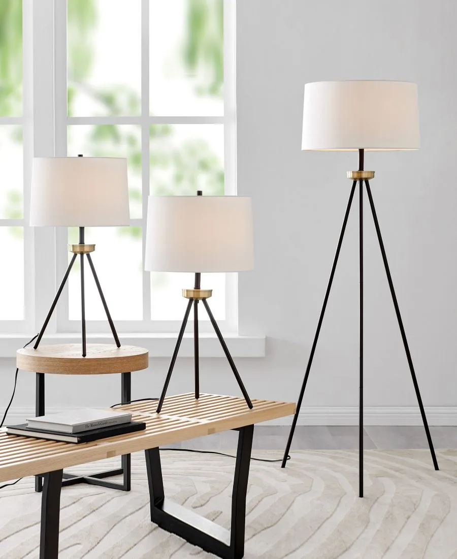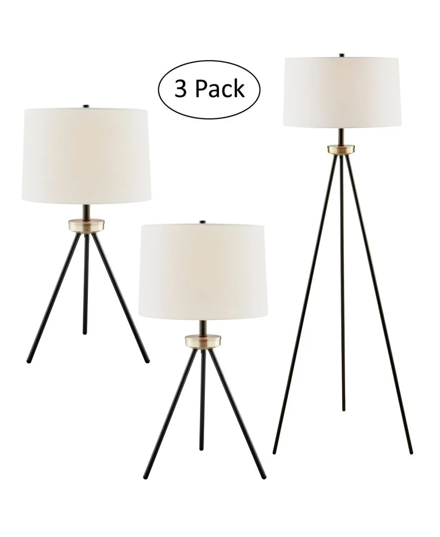Создайте неповторимую атмосферу стильного уголка с помощью этого комплекта из настольной и напольной ламп на треноге. Металлическое основание треноги придает светильнику великолепный силуэт. Лампа очаровательно увенчана тканевым абажуром в форме барабана. Этот комплект ламп идеально подойдет для гостиной или зоны для приема гостей.