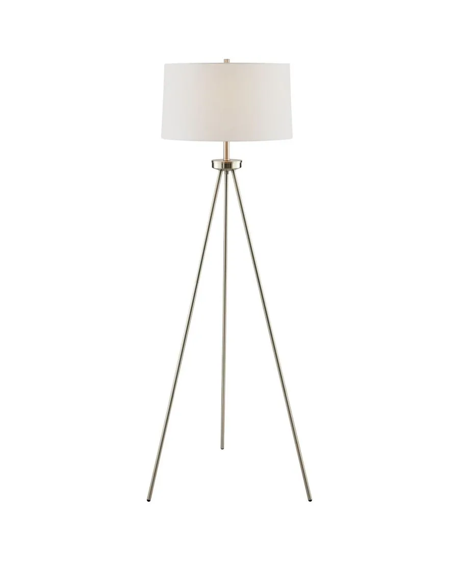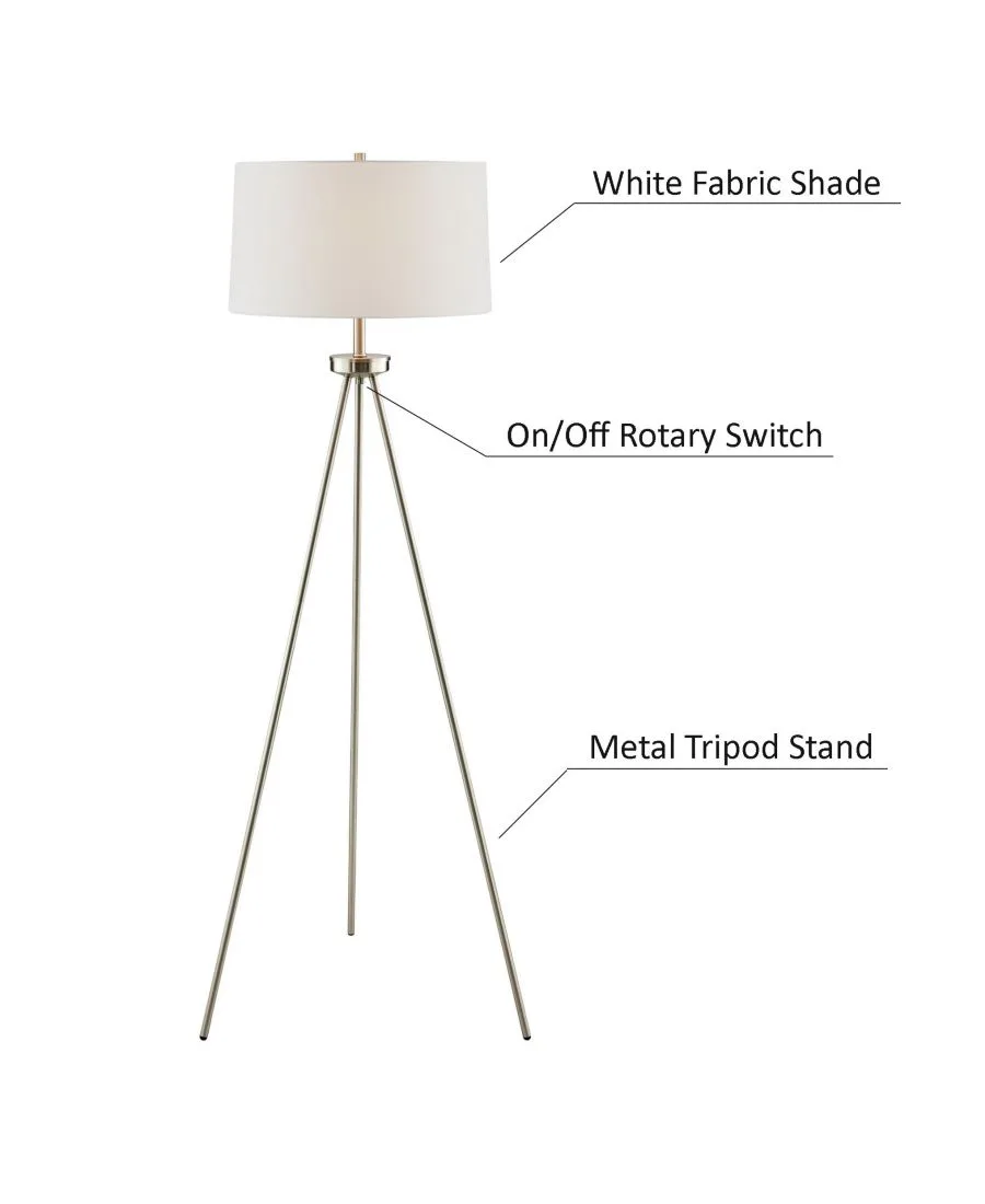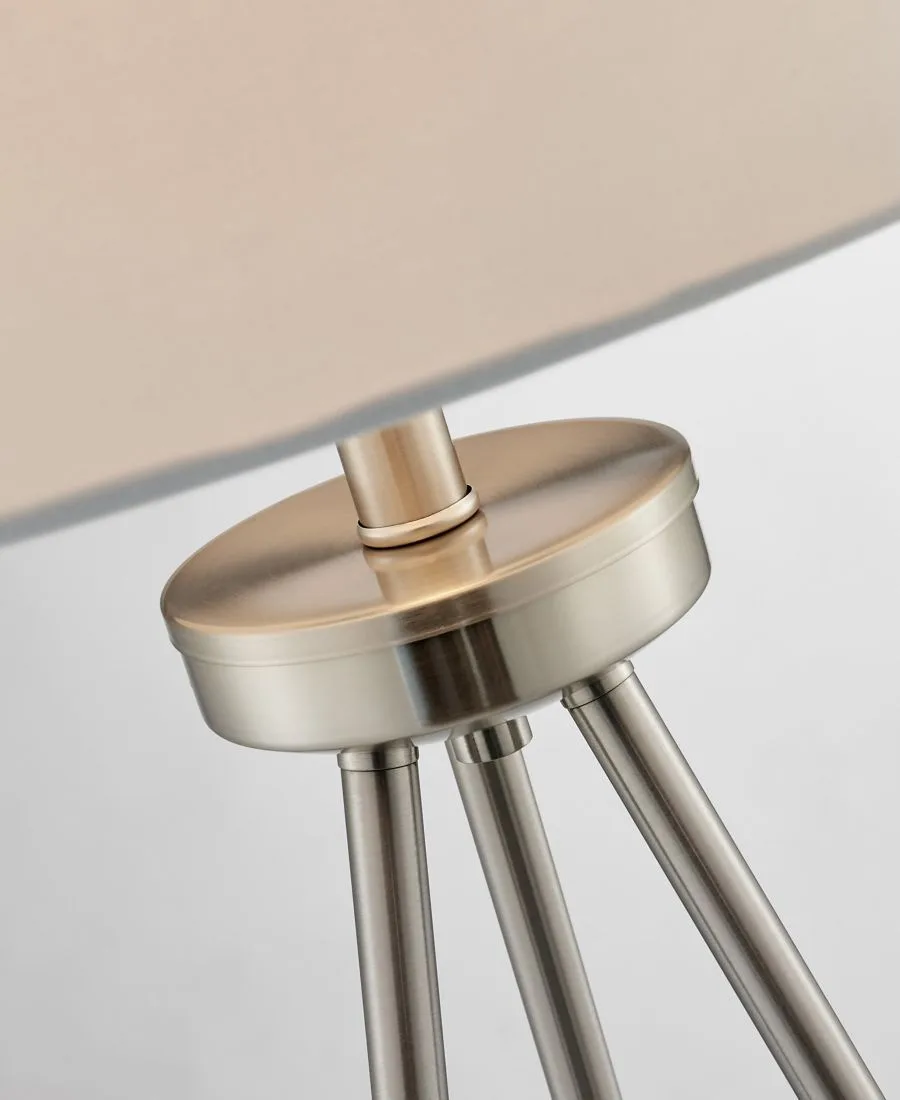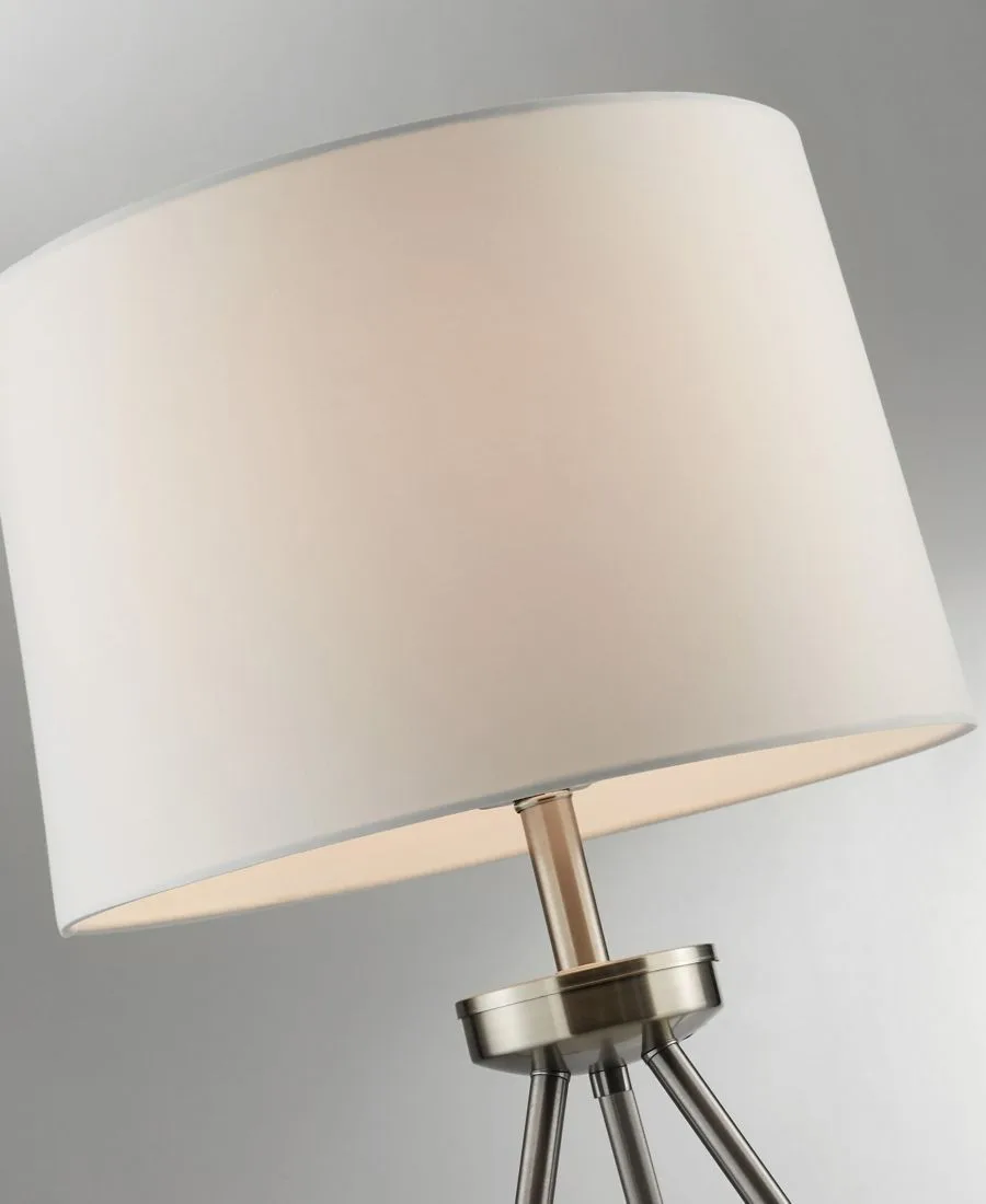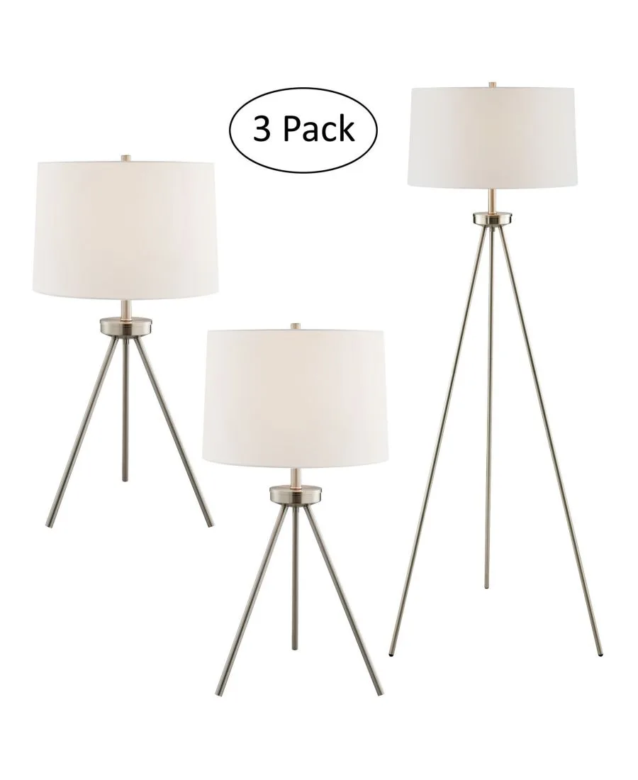 Создайте неповторимую атмосферу стильного уголка с помощью этого комплекта из настольной и напольной ламп на треноге. Металлическое основание треноги придает светильнику великолепный силуэт. Лампа очаровательно увенчана тканевым абажуром в форме барабана. Этот комплект ламп идеально подойдет для гостиной или зоны для приема гостей.