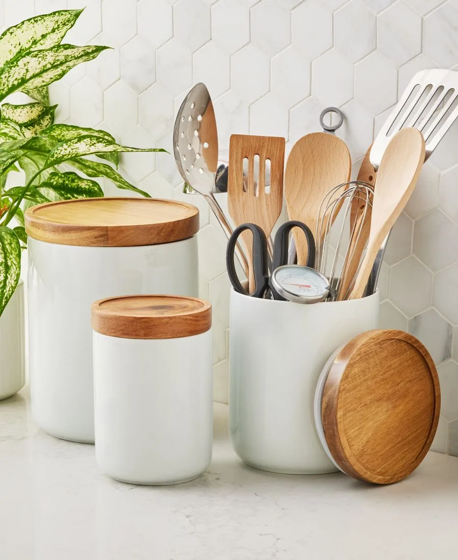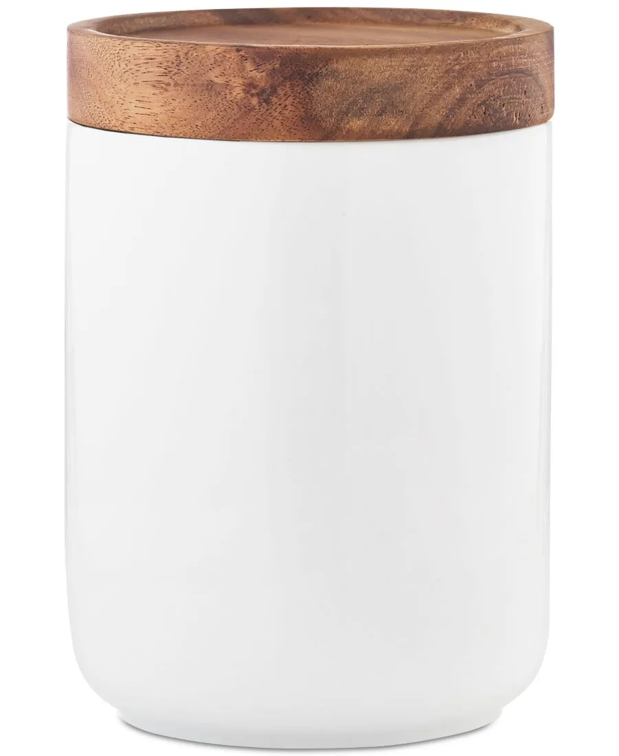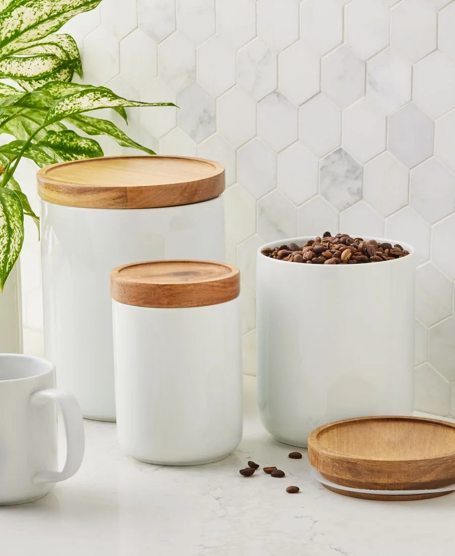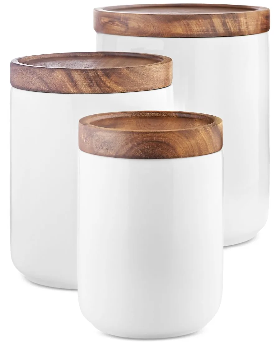 Добавьте функциональный и стильный элемент на кухонную столешницу с помощью этого универсального набора из трех банок от Tabletops Unlimited, выполненного из фарфора с деревянными крышками.