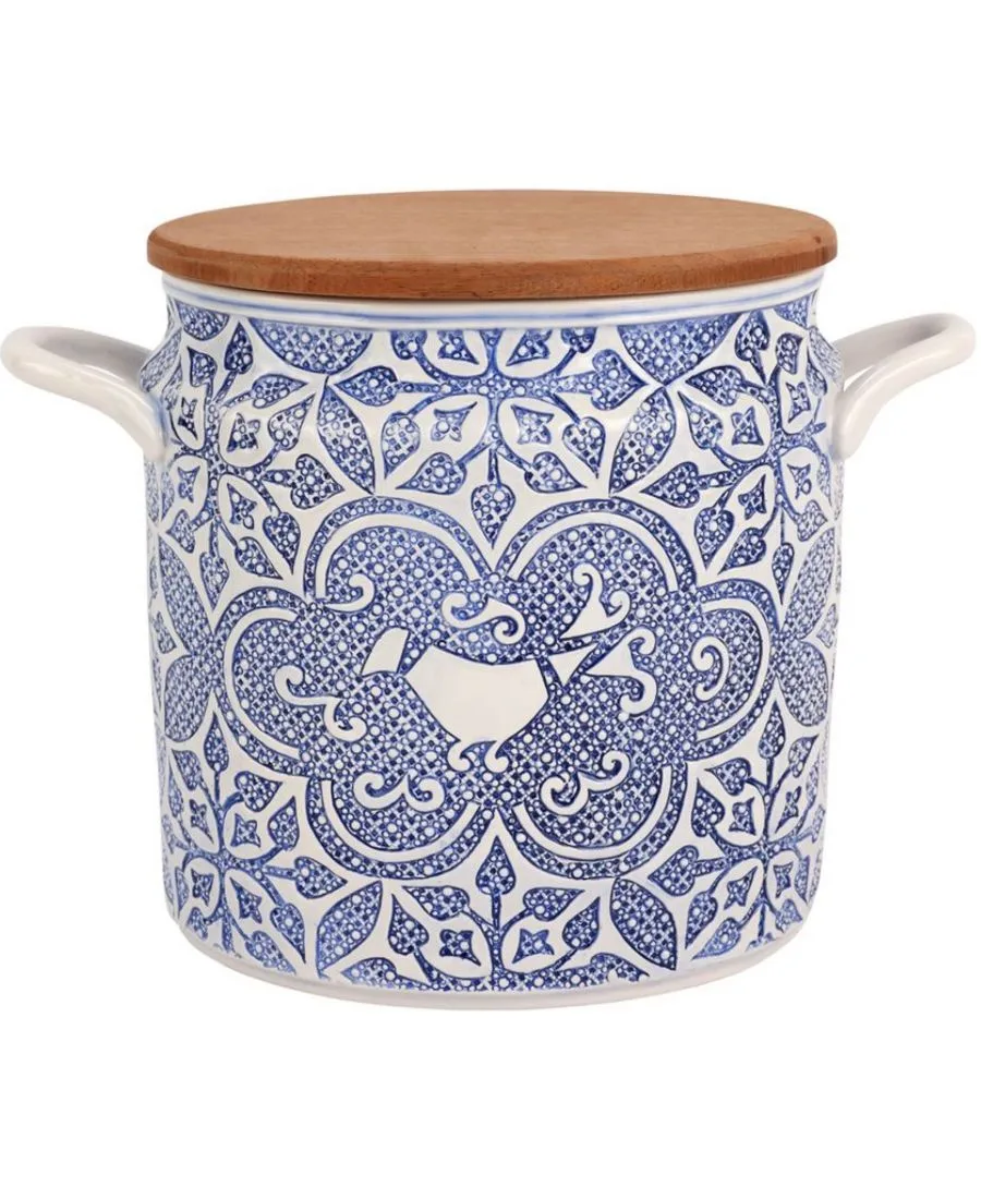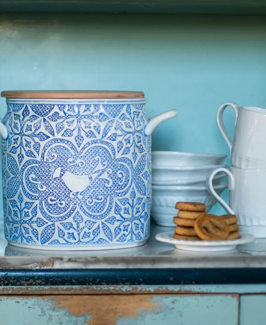 Вдохновленная расписной плиткой и текстилем Италии, банка для печенья Uccello Blu Biscotti Jar отдает дань уважения давней традиции страны в создании замысловатых геометрических узоров.