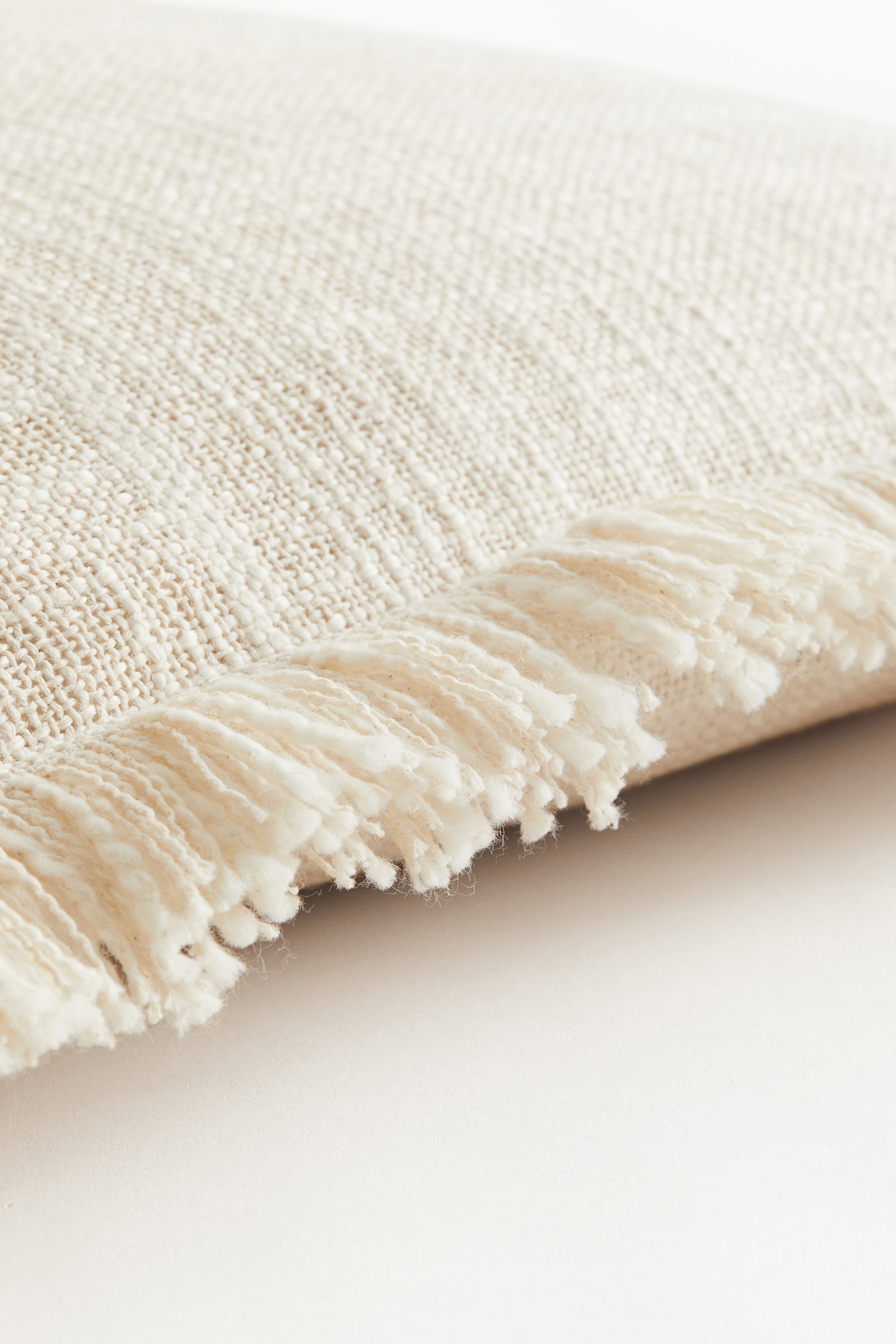 Эта наволочка изготовлена из хлопчатобумажной ткани с фактурным плетением. Края отделаны бахромой, сзади имеется потайная молния.