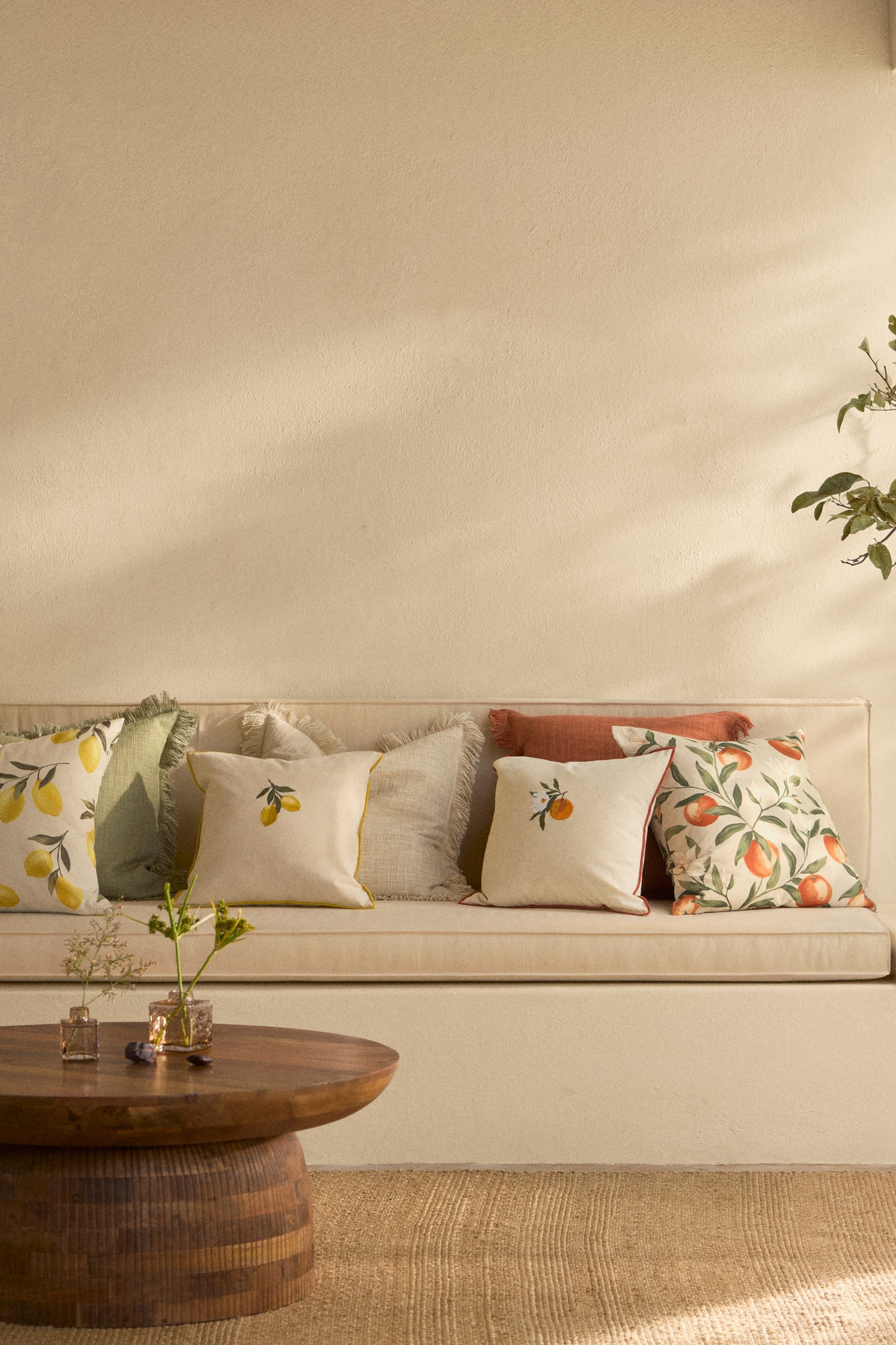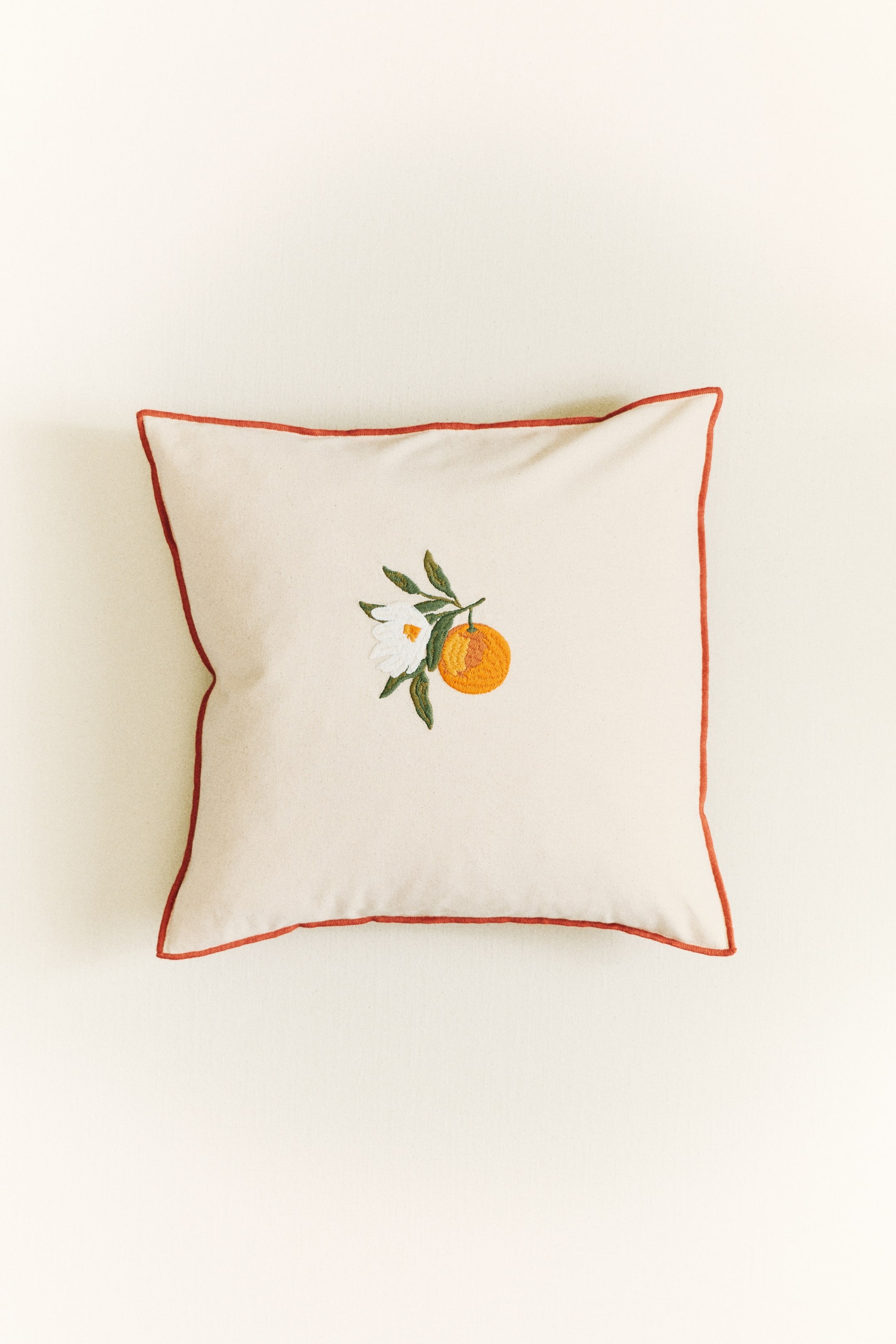 Эта наволочка изготовлена из хлопчатобумажной ткани. На лицевой стороне она украшена вышитым узором, а по краям – контрастной окантовкой. Сзади имеется потайная молния.