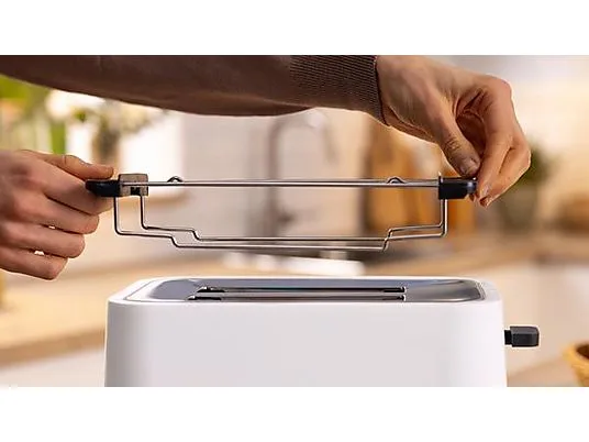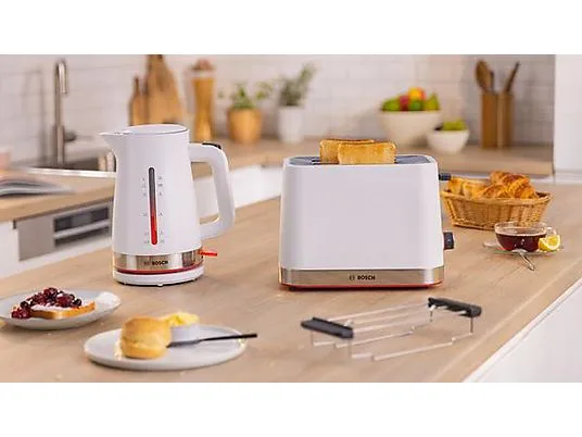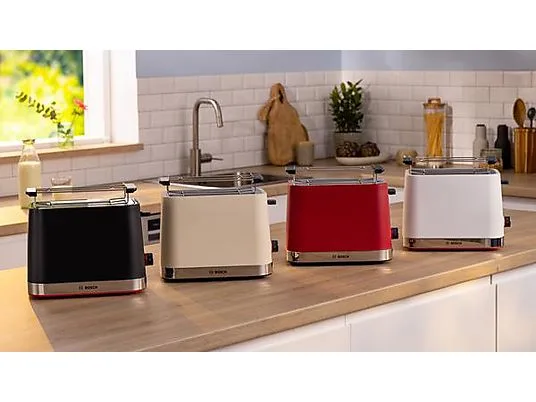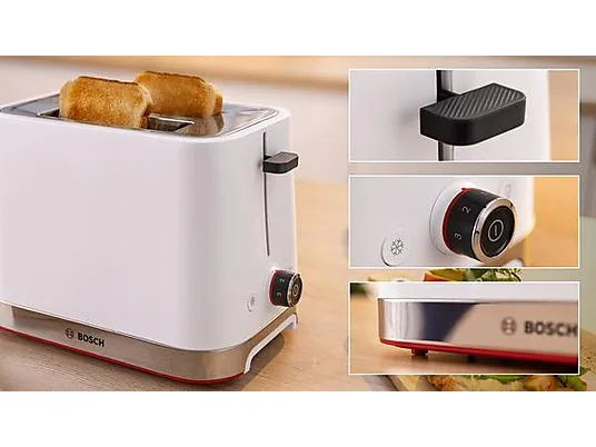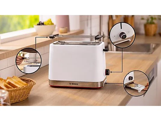 Тостер с удобным односторонним управлением и складной насадкой для булочек. Нержавеющая сталь и матово-глянцевые поверхности придают дополнительный стиль. Функция размораживания и подогрева: размораживает тосты и делает их хрустящими. Съемная и складная насадка для булочек: поджаривайте больше выпечки на универсальной и устойчивой насадке для булочек. Высокий подъем: легко извлекать даже небольшие кусочки хлеба. Легкодоступный поддон для крошек: простая очистка и извлечение. Автоматическое отключение: выключает тостер, если хлеб застрял. Показать подробности продукта BOSCH