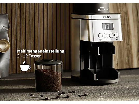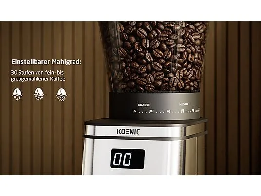 Идеальное начало вашего кофейного дня. С кофемолкой KOENIC KGC 163025 M вы получите максимум от своих зерен. Благодаря высококачественным коническим жерновам зерна перемалываются особенно бережно для аромата и равномерно. Так вы сможете наслаждаться свежим кофе с полным вкусом каждое утро. Высокая мощность 160 Ватт гарантирует, что ваш молотый кофе будет готов быстро, без долгого ожидания. При этом неважно, мелете ли вы всего 2 чашки для себя или до 12 чашек для семьи и друзей. Аромат благодаря коническим жерновам. KOENIC KGC 163025 M оснащена конической жерновой кофемолкой, которая работает на меньших оборотах, чем обычные жернова. Благодаря этому кофе не так сильно нагревается при помоле, и тонкие ароматы лучше сохраняются. С помощью 30 регулируемых степеней помола вы почувствуете разницу в каждой чашке, будь то мягкий или крепкий кофе. Так каждый кофе станет небольшим моментом наслаждения. 30 степеней помола для вашего любимого кофе. С KOENIC KGC 163025 M вы можете выбрать из 30 регулируемых степеней помола, идеально подходящих для френч-пресса, фильтр-кофе или эспрессо. Вы легко определяете, насколько мелко или крупно должны быть смолоты ваши зерна. Таким образом, вы можете оптимально настроить свой кофе под выбранный способ приготовления. Больше контроля означает больше удовольствия в вашей чашке. Кроме того, кофемолка предлагает возможность молоть кофе непосредственно в портафильтр с помощью адаптера двух размеров (51,5 мм и 58 мм). Большой контейнер для зерен, четкий обзор. KOENIC KGC 163025 M предлагает вместительный контейнер для кофейных зерен объемом до 300 г. Это идеально, если вы часто мелете или для нескольких человек. Благодаря практичному индикатору уровня вы сразу видите, когда пора досыпать. Таким образом, вы не будете внезапно застигнуты врасплох нехваткой зерен. Вы всегда контролируете свой запас кофе. Кроме того, в вашем распоряжении имеется контейнер для молотого кофе объемом 150 г с антистатической функцией, благодаря чему молотый кофе собирается аккуратно, и вы всегда контролируете свой запас кофе. Безопасно, практично и современно. В KOENIC KGC 163025 M прочный пластиковый корпус с элементами из нержавеющей стали сочетается с продуманными функциями. Индикатор работы всегда показывает, включено ли устройство. Кроме того, функция автоматического отключения гарантирует, что кофемолка выключится сама по истечении определенного времени, что экономит электроэнергию и дает вам чувство уверенности. Так вы сможете расслабленно сосредоточиться на своем кофе. Есть еще вопросы по этому продукту? С нашим чат-ботом «SmartManual» вы получите быструю и надежную поддержку круглосуточно. Прямо в веб-браузере на любом устройстве. Независимо от того, ищете ли вы информацию об использовании, технические данные, характеристики продукта или помощь по часто задаваемым вопросам: «SmartManual» ответит на ваши вопросы в режиме реального времени. Чат-бот доступен для наших собственных брендов KOENIC, ok. и PEAQ. Ссылка на чат-бот: https://imtron.eu/chatbot
