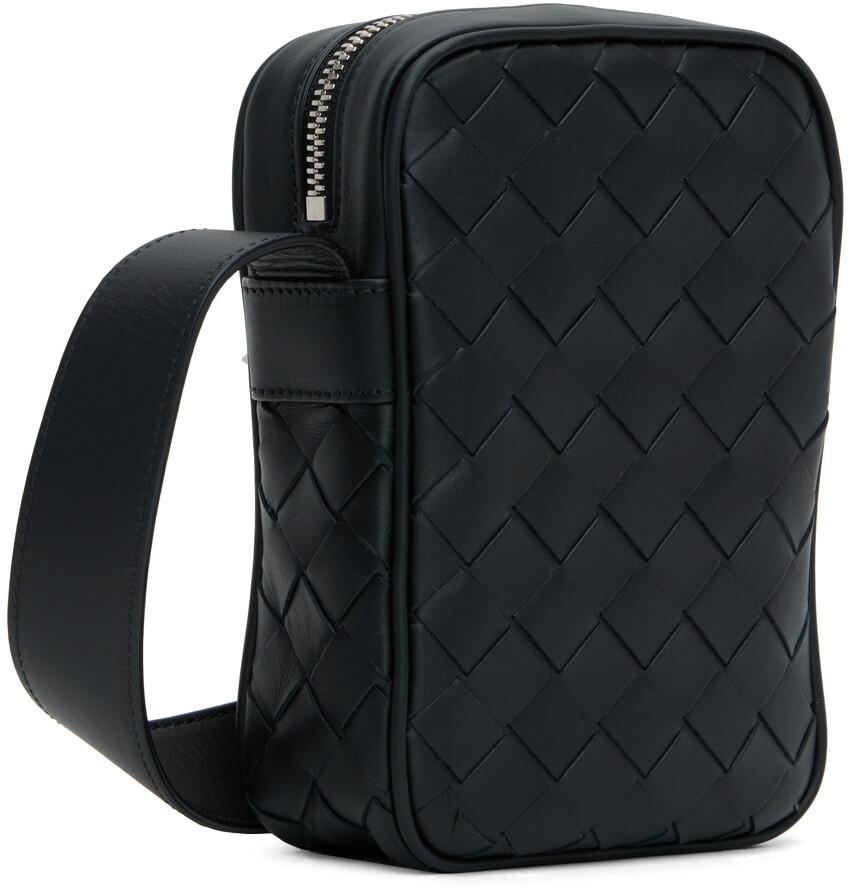 Черная сумка Intrecciato. Сумка-мессенджер из зернистой кожи ягненка интреччато черного цвета. Регулируемый плечевой ремень с заклепками. Застежка-молния. Подкладка из зернистой телячьей кожи. Серебристая фурнитура. Высота 6,75 x Ш 9,5 x D 2,25. Цвет поставщика: телячья кожа черного/серебристого цвета. Сделано в Италии.