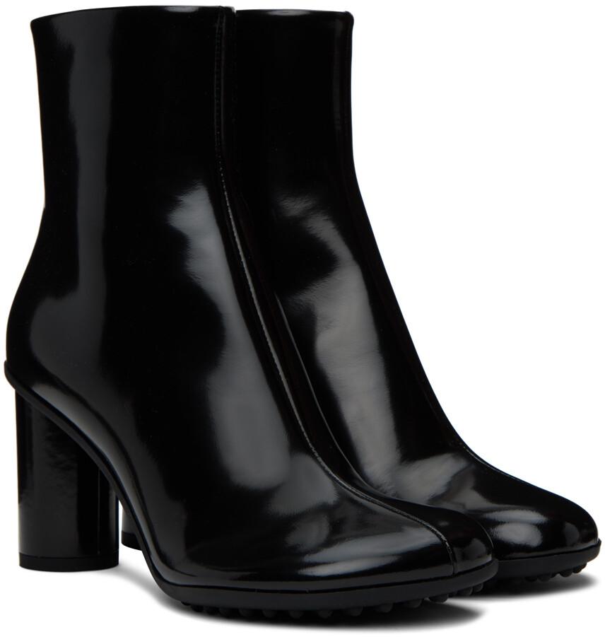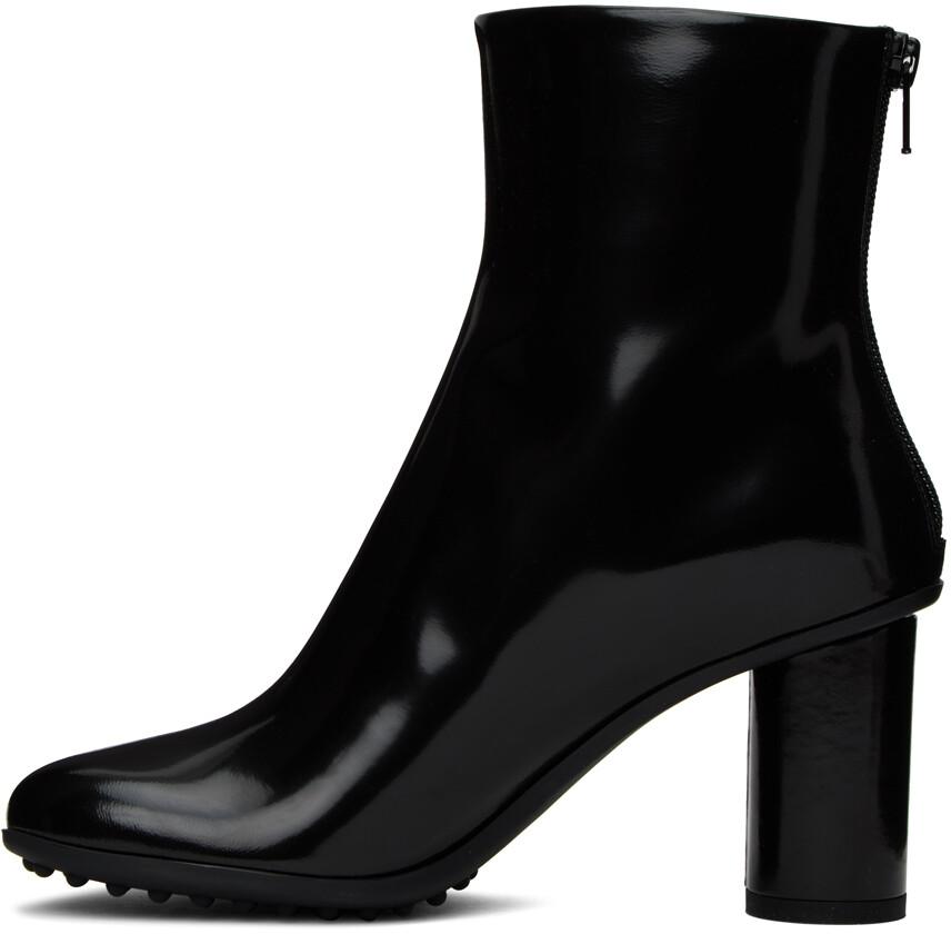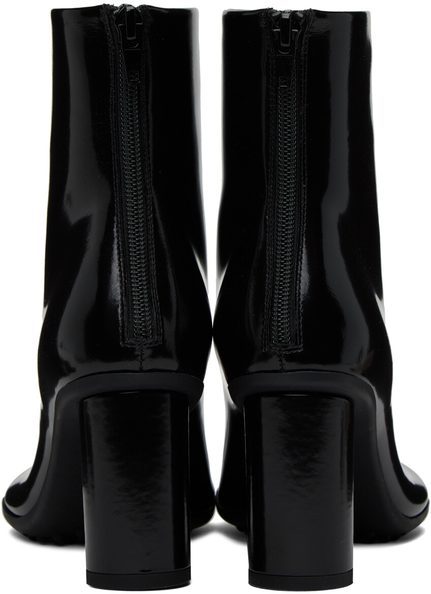 Черные атомные ботинки. Черные сапоги из полированной кожи ягненка до щиколотки. Модифицированный квадратный носок. Застежка-молния на пятке. Подкладка из полированной кожи ягненка. Покрытый цилиндрический блочный каблук. Резиновая подошва с рисунком. Каблук: H3, цвет поставщика: черный. Верх: кожа ягненка. Подошва: резина. Сделано в Италии.