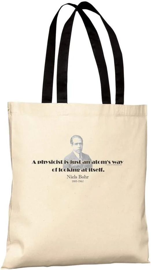 На сумках ThinkerShirts изображена ваша любимая известная цитата и ее автор. Сумка размером 16 на 15 дюймов (40 на 38 см) выполнена из ткани натурального цвета и имеет черную ручку. Эта сумка-шоппер из коллекции ThinkerShirts украшена изображением датского писателя и его знаменитой цитатой: «Физик — это всего лишь способ, которым атом смотрит на себя». ThinkerShirts — 5000 лет мудрости, которую можно носить. Идеальный подарок для мыслителей от девяти до 90 лет.