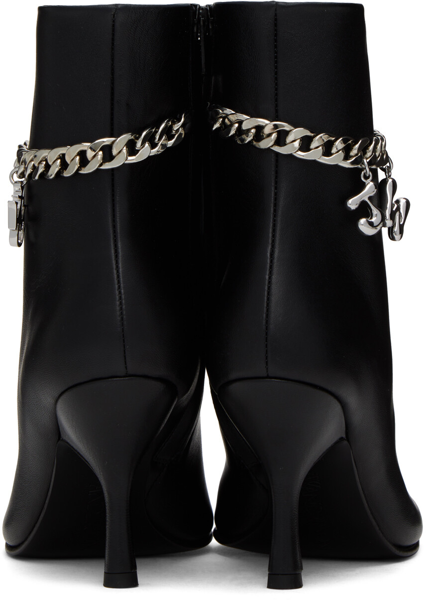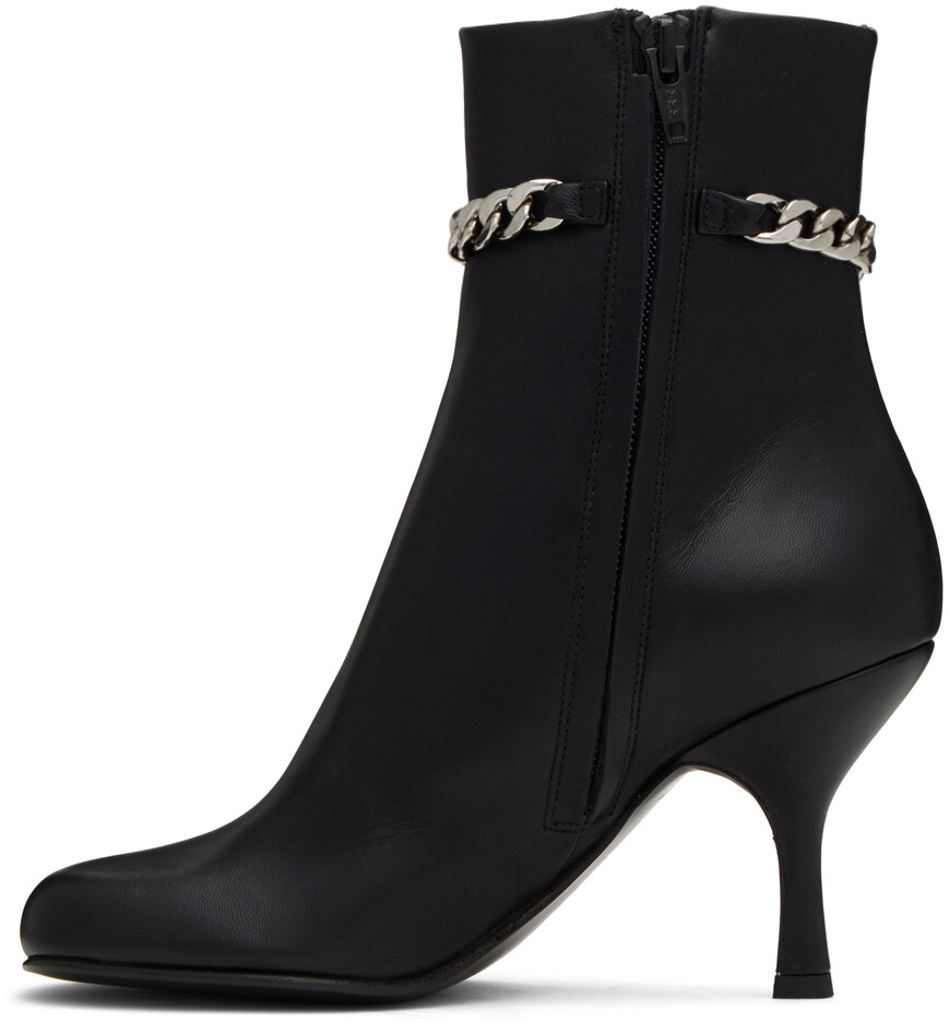 Черные ботинки с подвесками. Черные кожаные сапоги до щиколотки из полированной кожи. Цепочка-панцирь с подвесками-логотипами на щиколотке. Застежка-молния с внутренней стороны. Обтянутый каблук-шпилька с резиновыми вставками. Кожаная подошва. Серебристая фурнитура. Каблук: H3,5. Цвет поставщика: черный. Верх: кожа. Подошва: кожа, резина. Сделано в Италии.