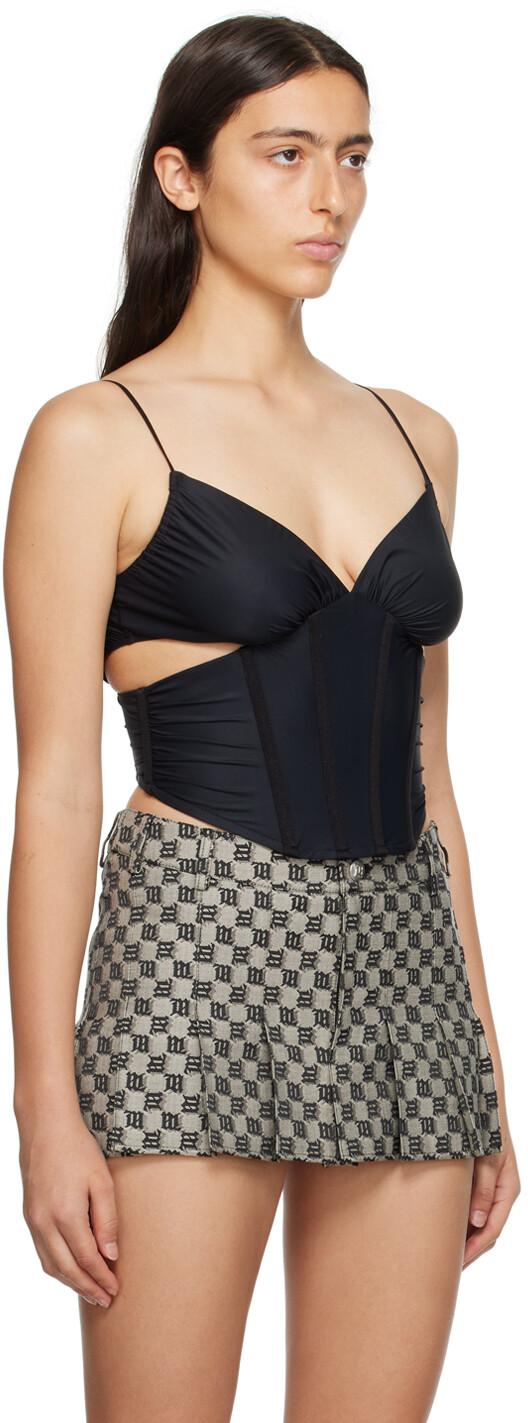 Черный укороченный камзол. Майка корсетного типа из эластичного нейлонового джерси. Обвалка повсюду. Вырез в форме сердца Сборка и рюши спереди Вырезы на талии Укороченный низ Регулируемые бретельки-спагетти Застежка-молния сзади На подкладке Цвет поставщика: Черный 75 % полиамид, 25 % эластан. Сделано в Польше.