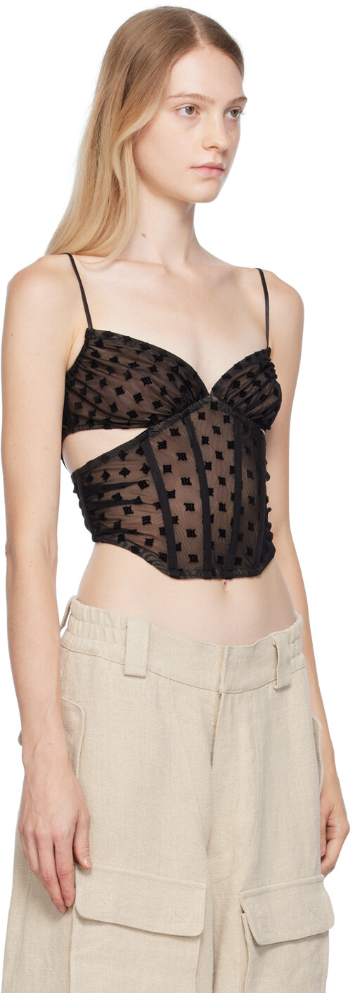 Черный корсет с монограммой. Полупрозрачный эластичный сетчатый корсет из смеси нейлона и вискозы. Косточки и монограмма-логотип вкраплены повсюду. Сборки на шее и боковых швах. Вырезы в боковых швах. Регулируемые эластичные бретельки-тонкие. Застежка-молния сзади. Подкладка из сетки. Цвет поставщика: черный. Основная часть: 58 % полиамид, 38 % вискоза, 4 % эластан. Подкладка: 82 % полиамид, 18 % эластан. Сделано в Польше.