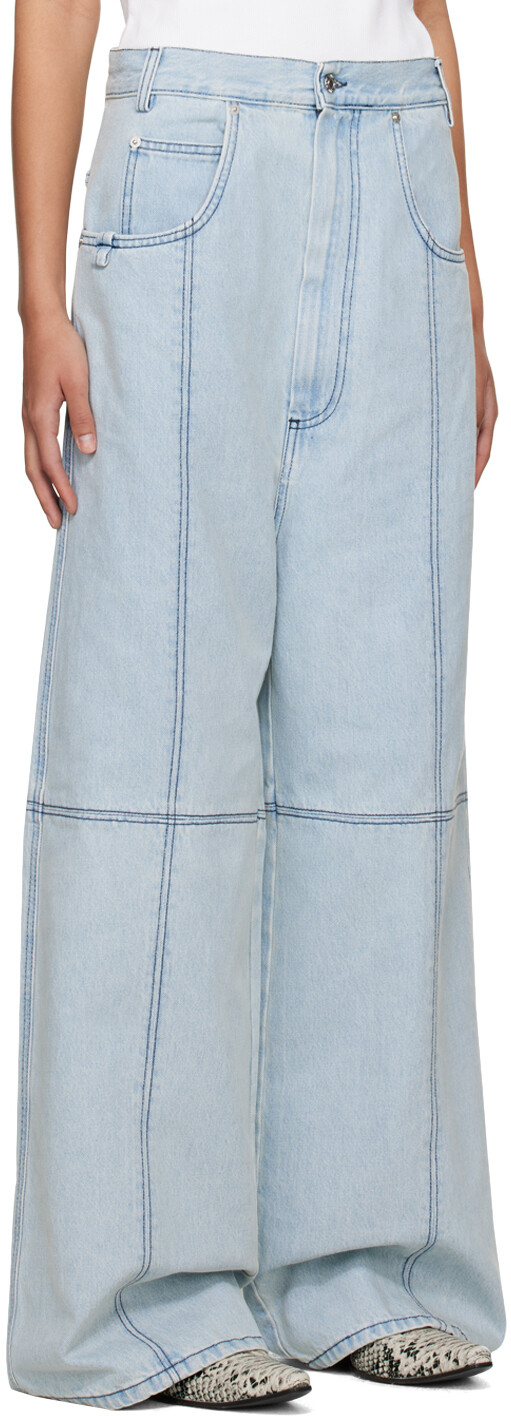 Синие джинсы со вставками. Джинсы из неэластичного денима. Панельная конструкция. Петли для ремня. Модель с пятью карманами. Застежка-молния. Нашивка с логотипом на поясе сзади. Цвет поставщика: Ледяной синий. 100 % хлопок. Сделано в Италии.