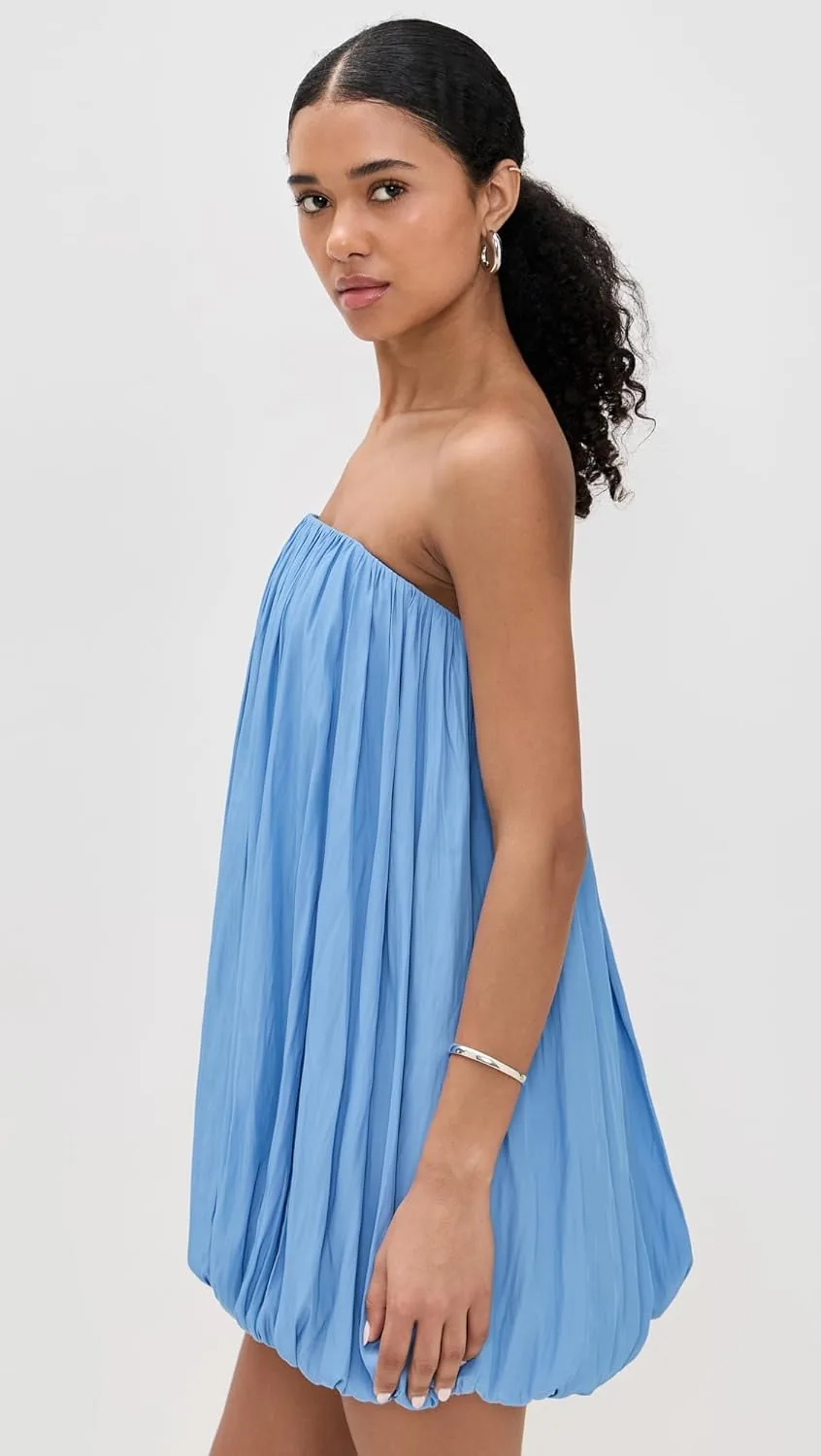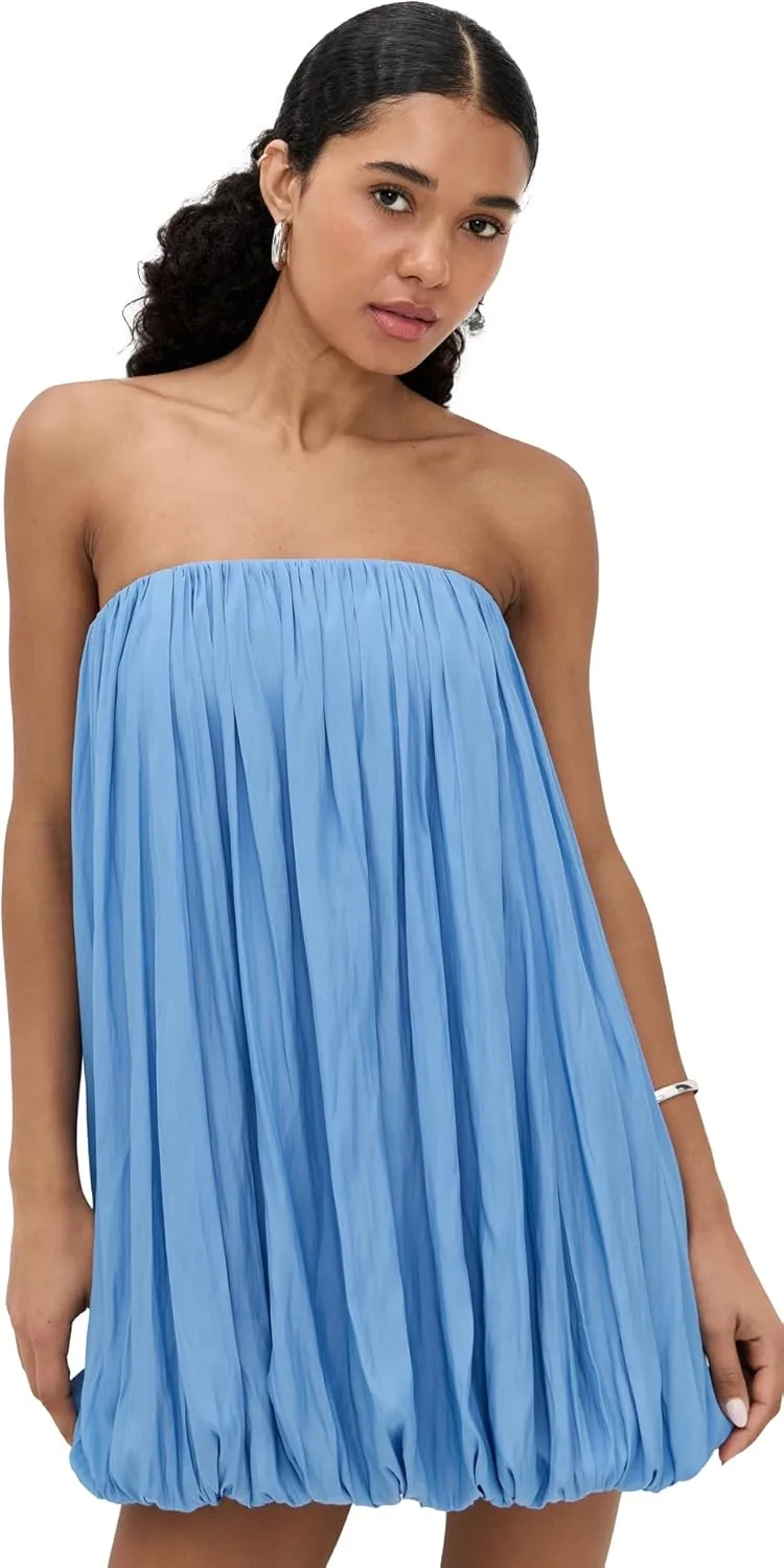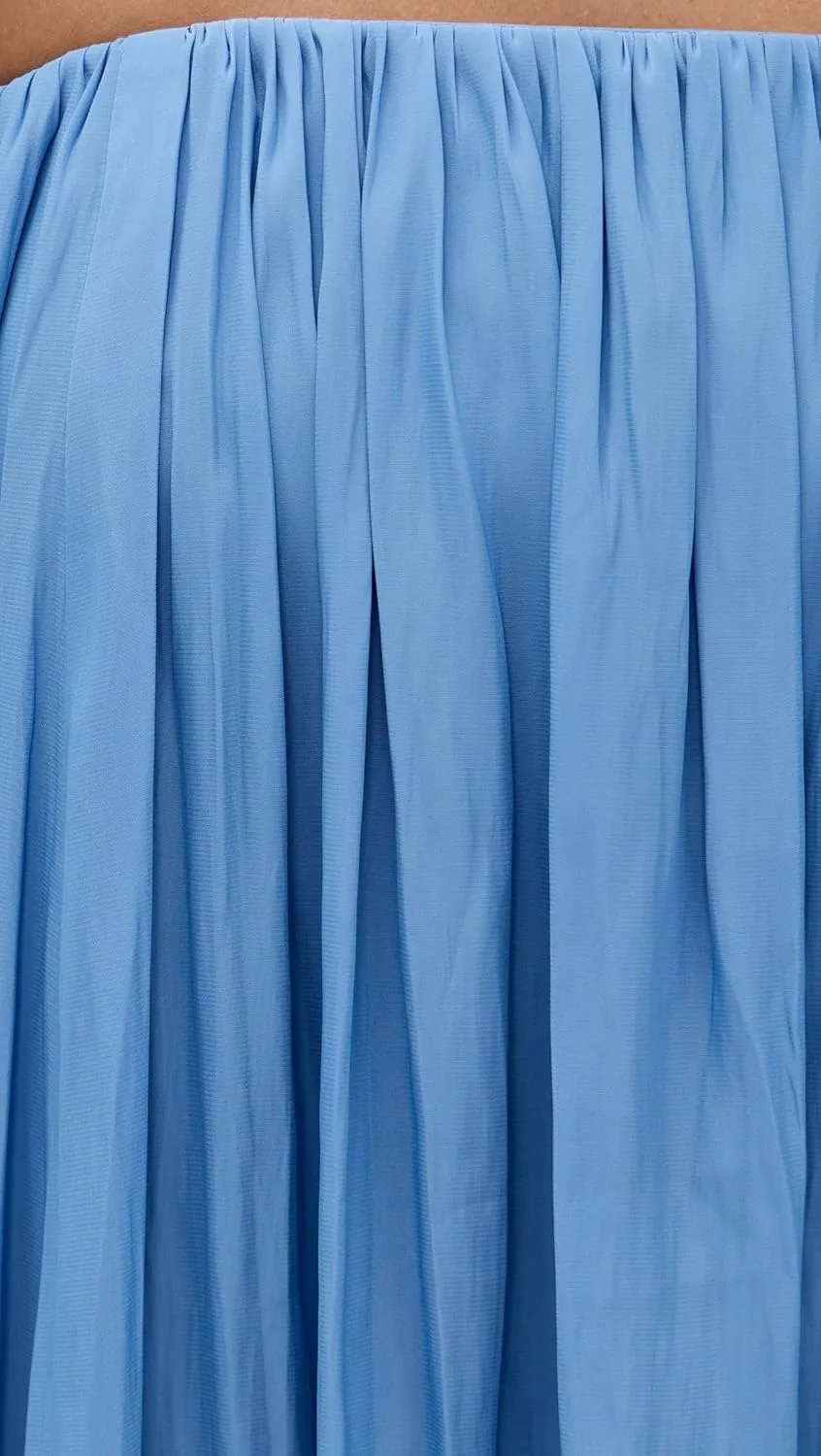 Это мини-платье без бретелей, выполненное в нежно-голубом оттенке, украшено складками по всей поверхности и имеет пышный подол.