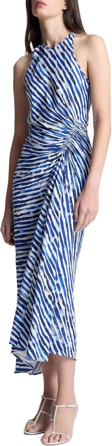Это платье миди в темно-синюю полоску имеет высокий воротник и асимметричную драпировку на бедрах.