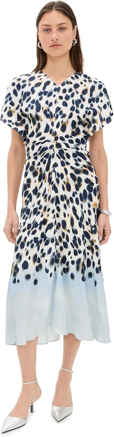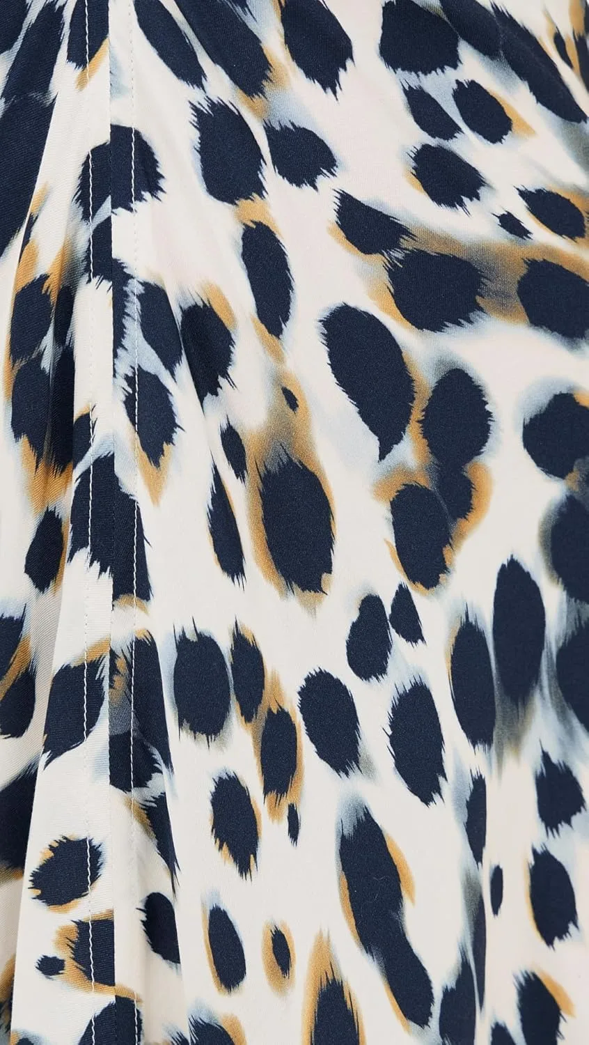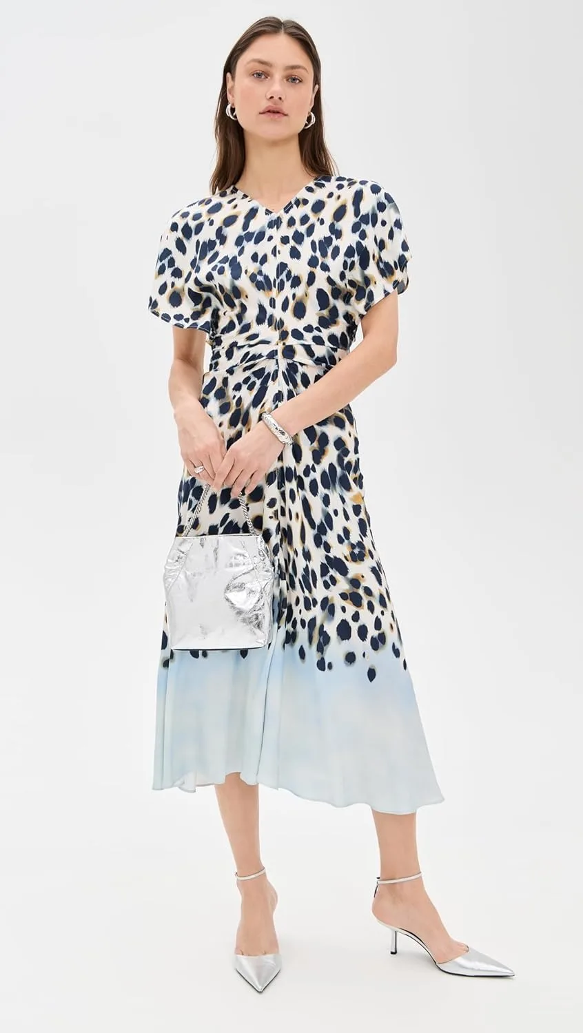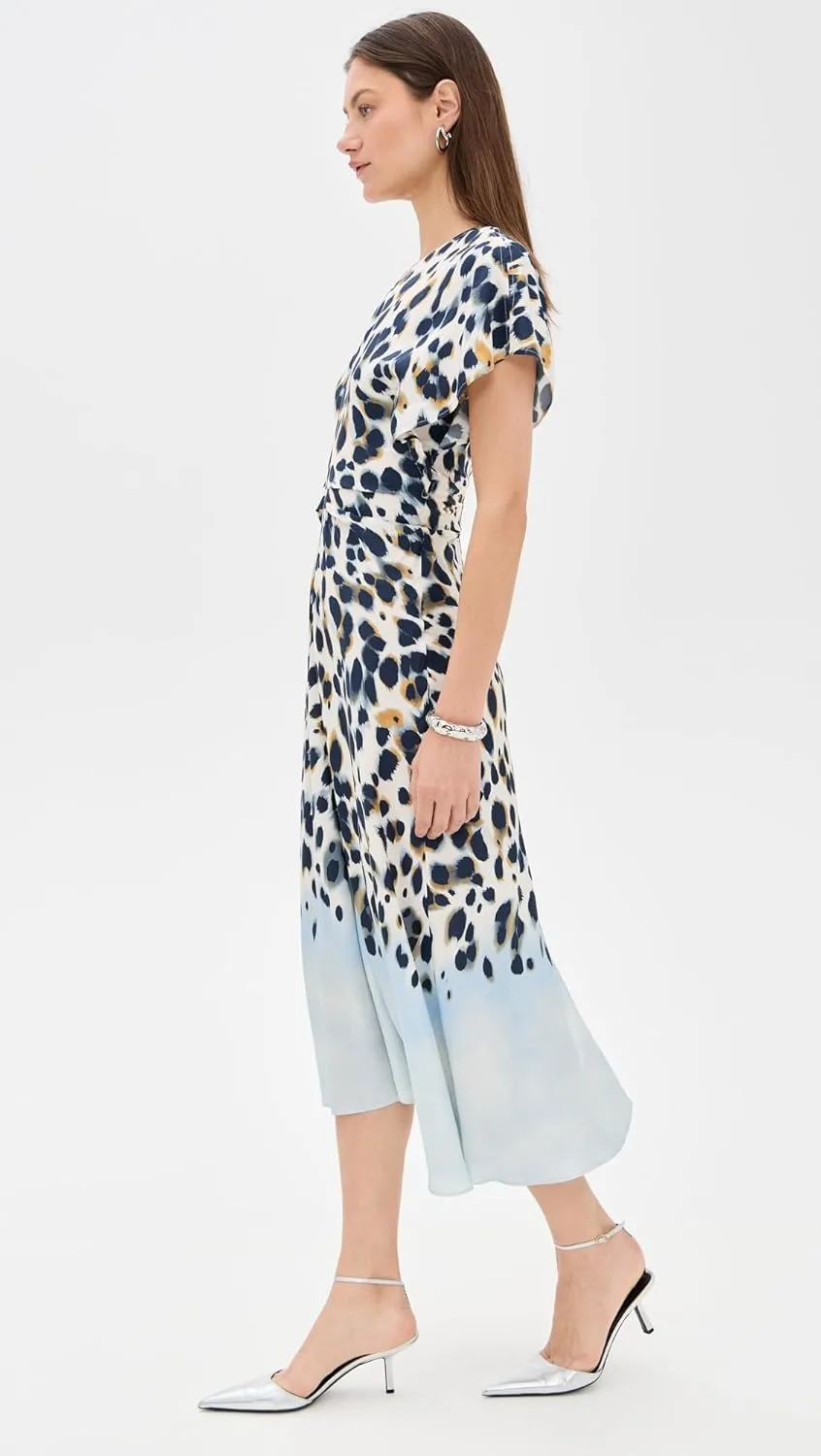 Это платье миди, выполненное в живописном сочетании темно-синего, горчичного и светло-голубого цветов, имеет рукава-крылышки и сборки на талии.