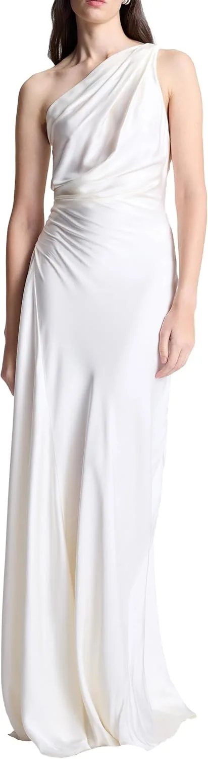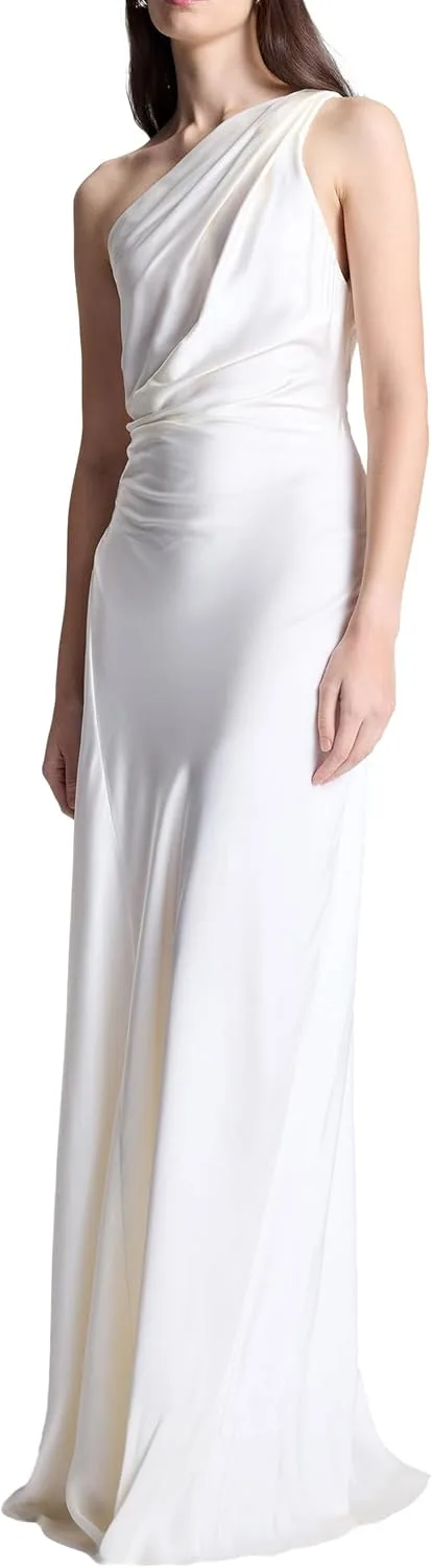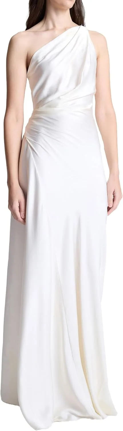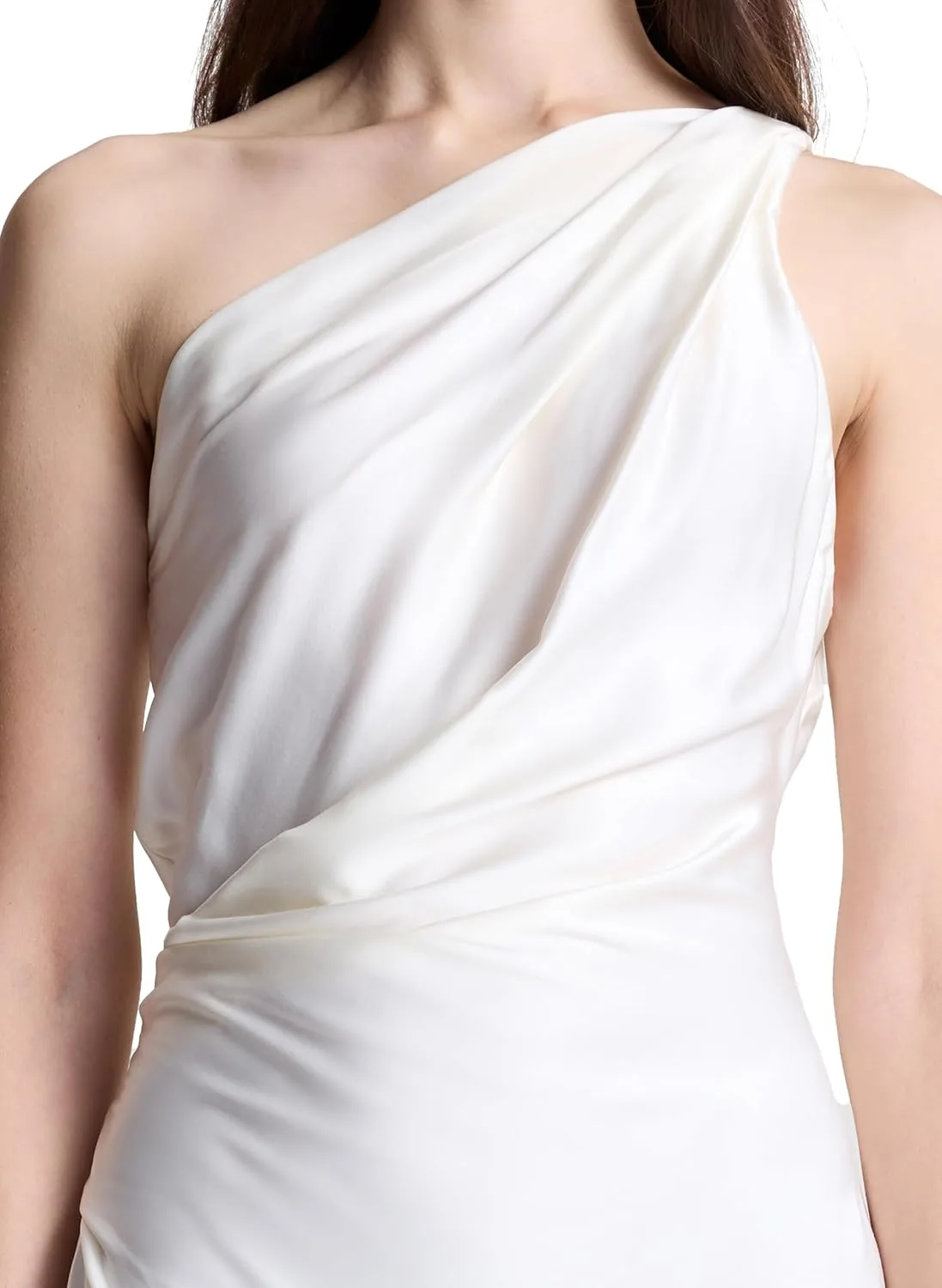 Это платье на одно плечо, выполненное в салатовом оттенке, украшено мягкими складками на плече и талии.