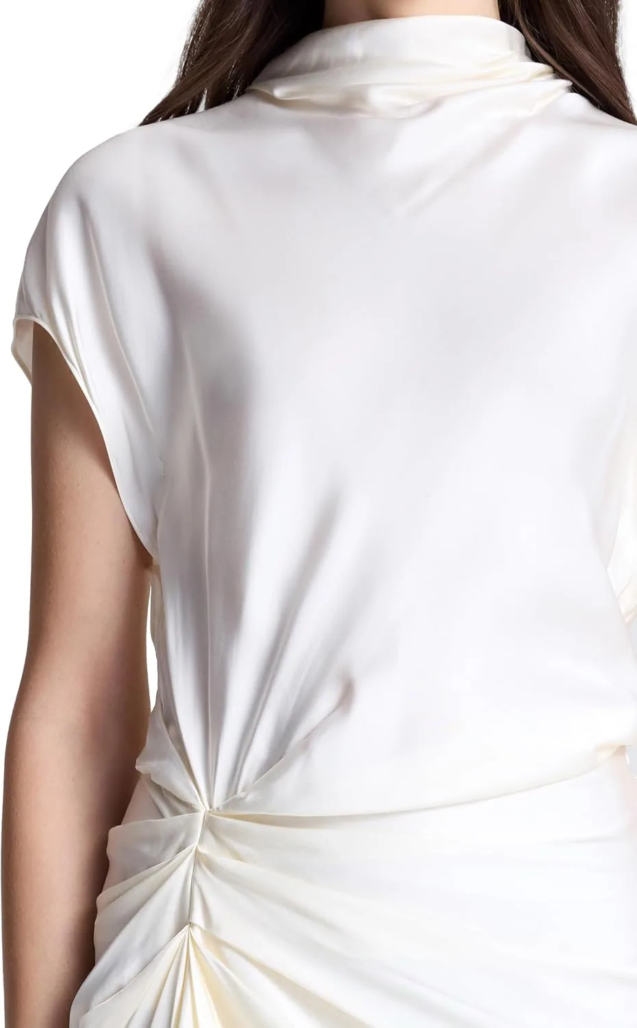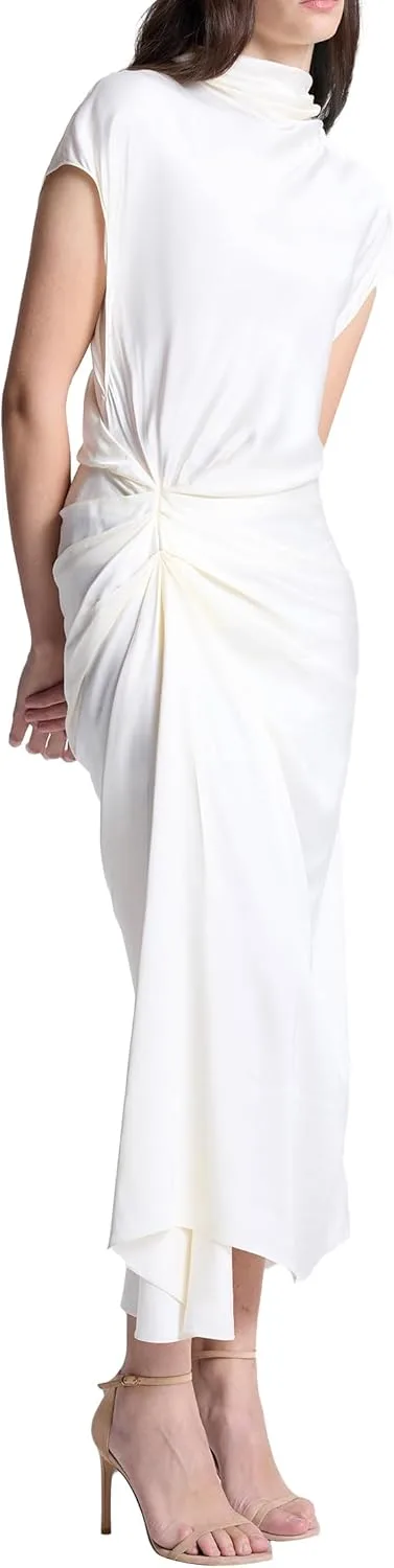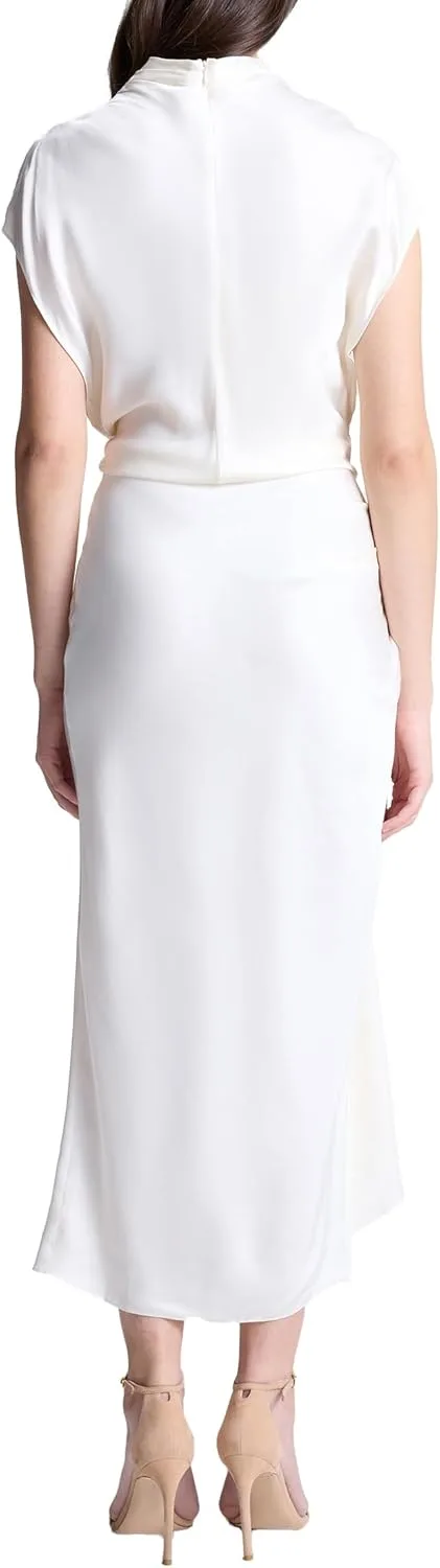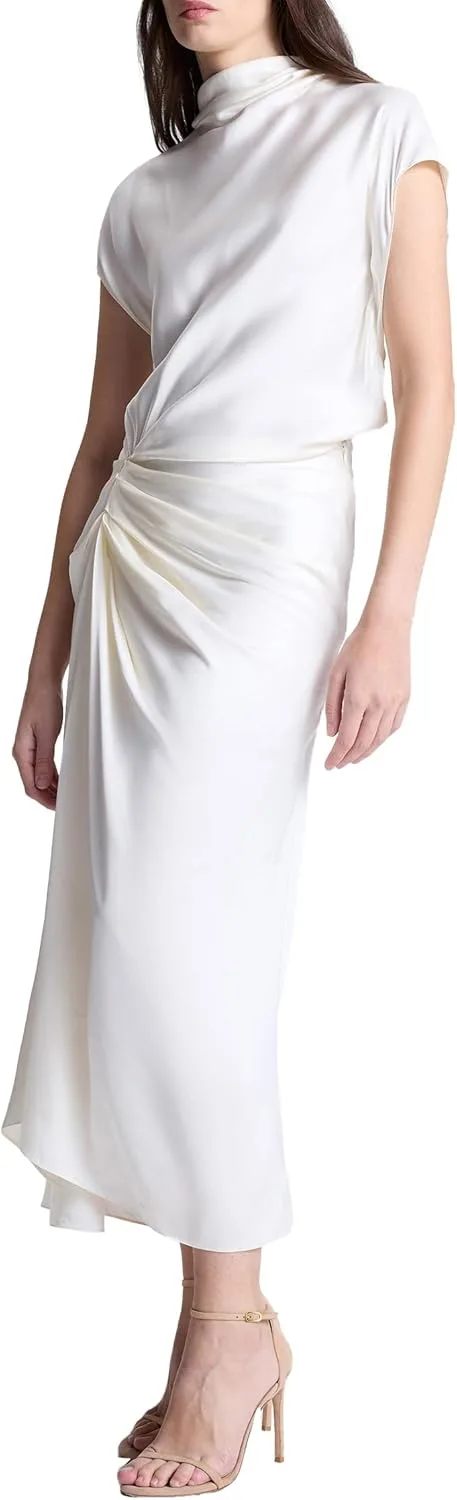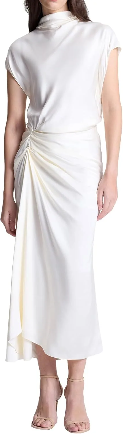 Это элегантное платье миди кремового оттенка с драпировкой, короткими рукавами и изящным изгибом в области бедра.
