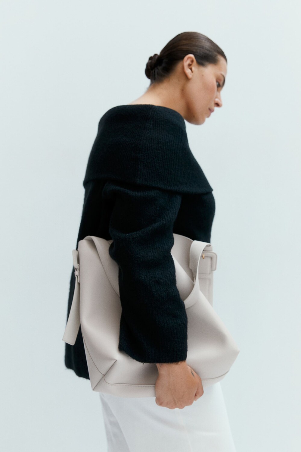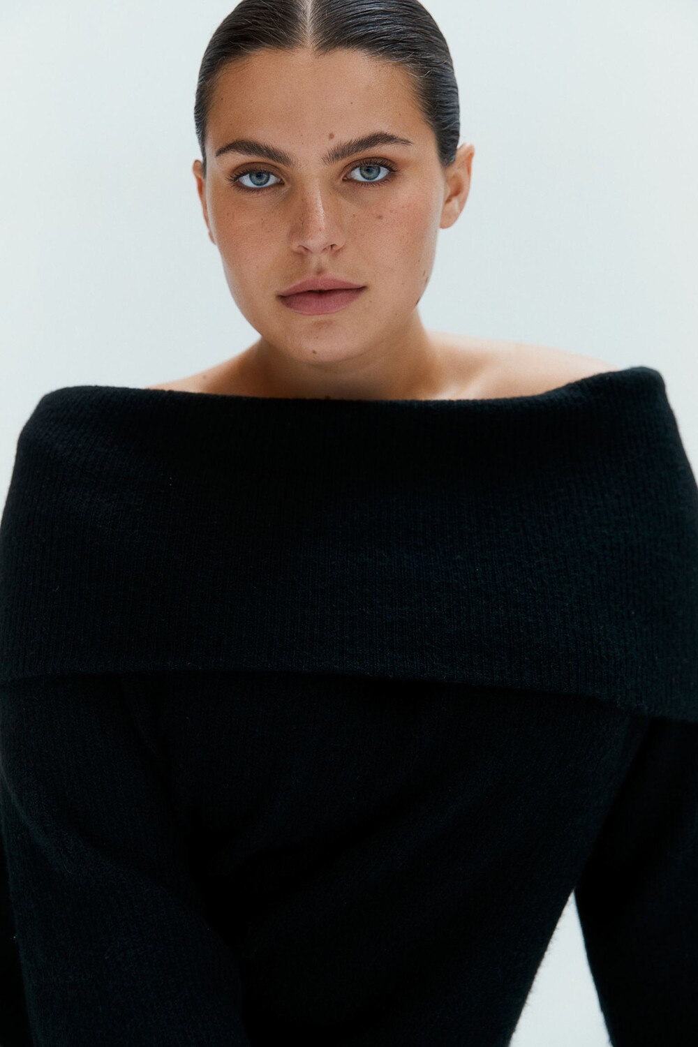 Свитер в рубчик из мягкого трикотажа с примесью шерсти. Открытые плечи, широкие закатанные манжеты и рукава реглан.