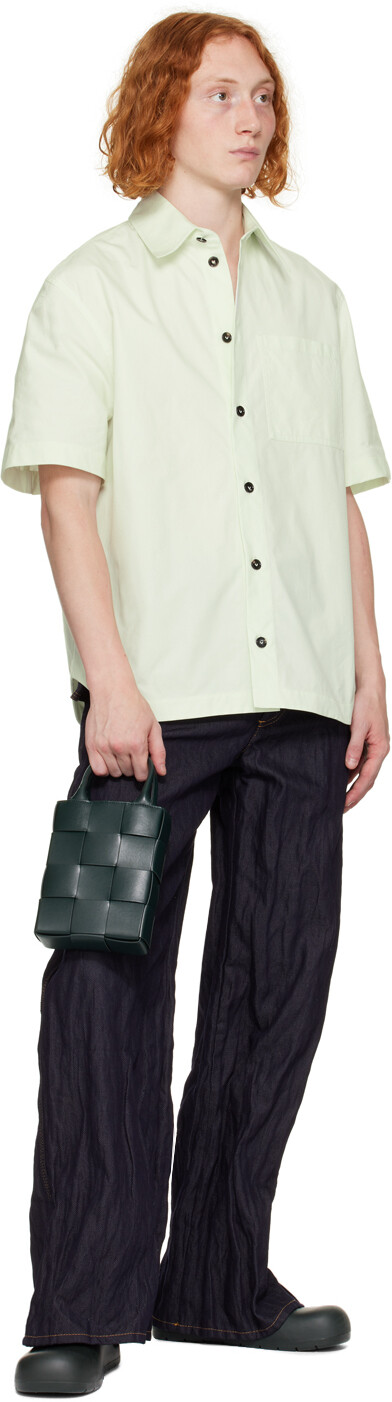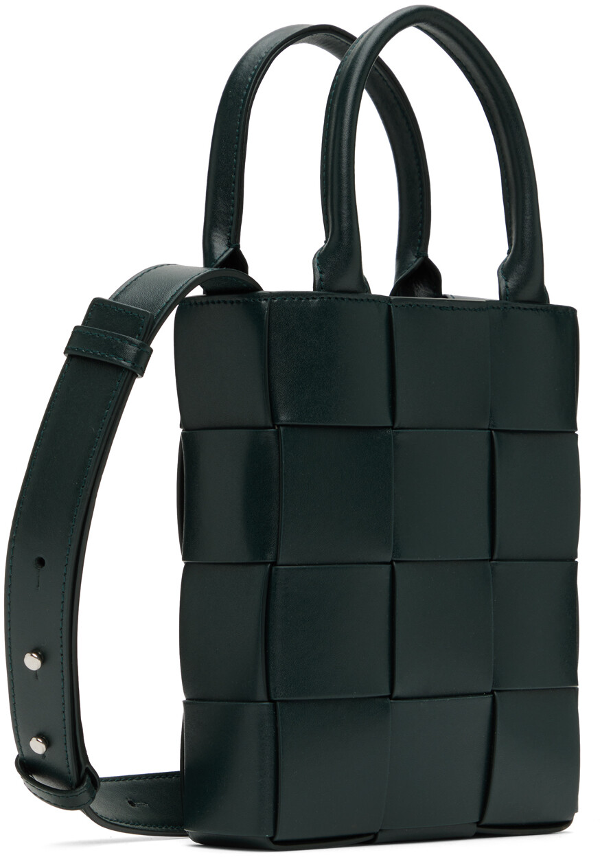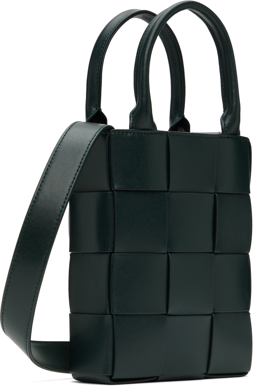 Зеленая мини-тоут-кассета. Зеленая сумка-тоут из полированной телячьей кожи с плетением интреччио. Фиксированные ручки для переноски. Съемный регулируемый плечевой ремень. Без подкладки, В7,5 x Ш6 x D2, цвет поставщика: Чернильница/Серебристая телячья кожа. Сделано в Италии.