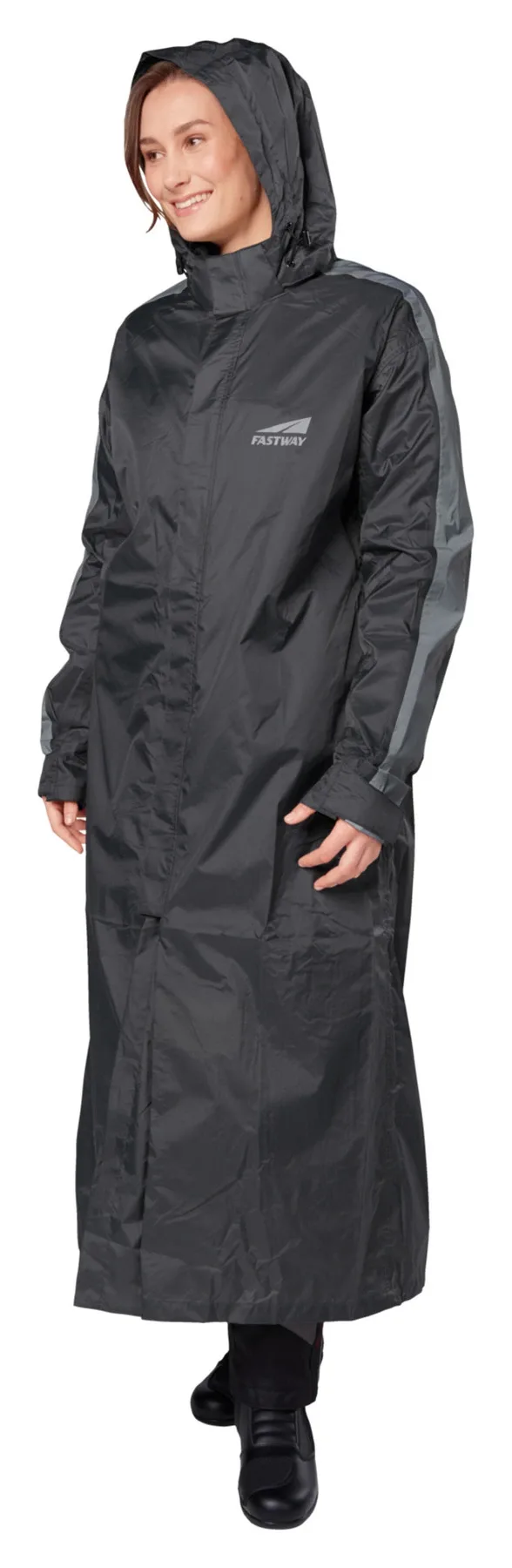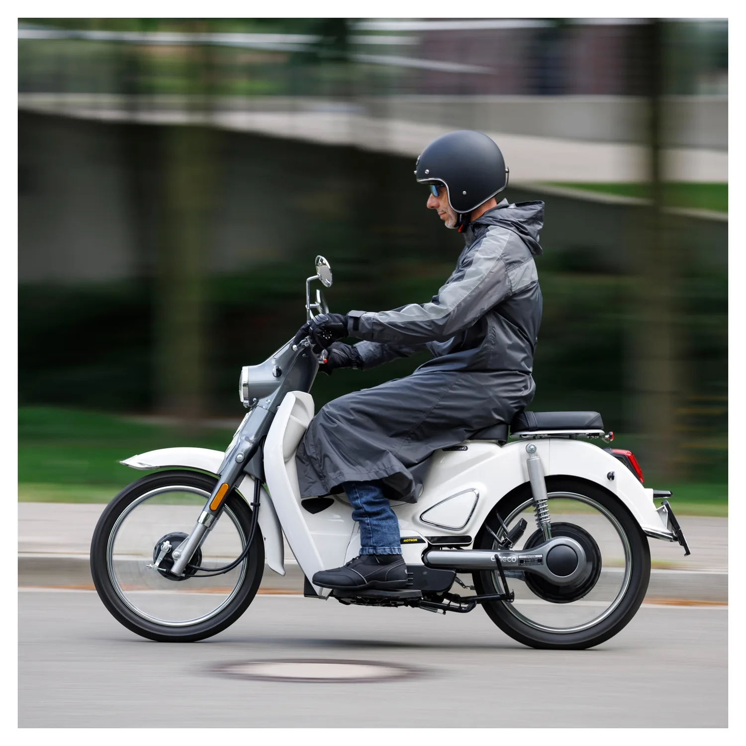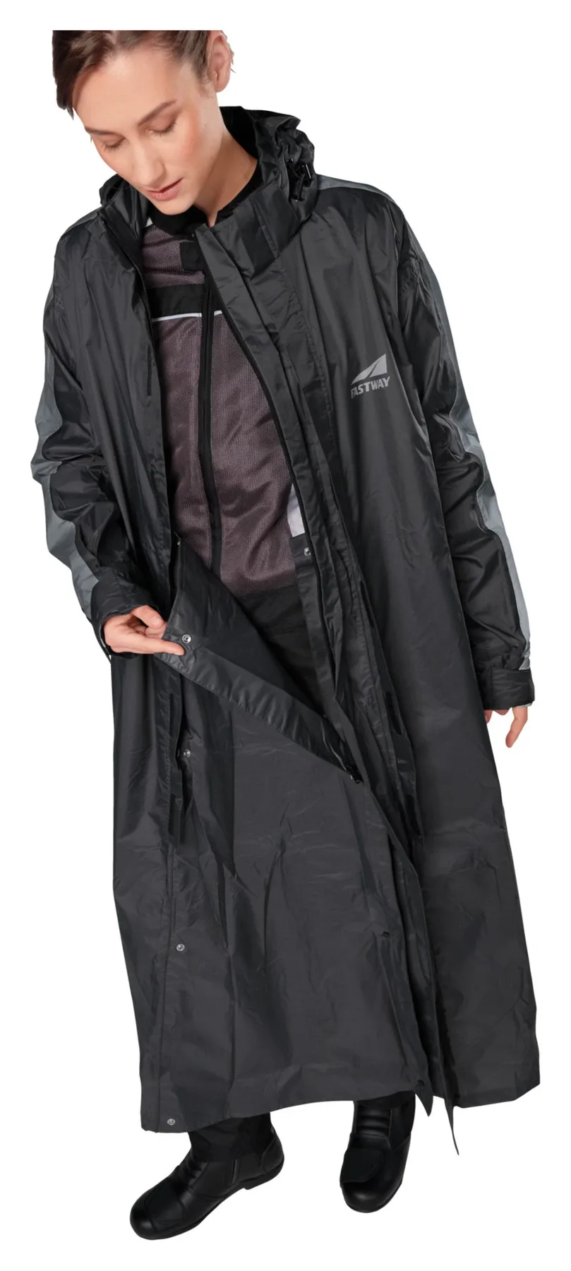 Этот длинный дождевик - абсолютно ветро- и водонепроницаемый - защищает от сырости и холодного ветра. Дополнительно благодаря использованию светоотражающего материала значительно улучшается "быть замеченным".