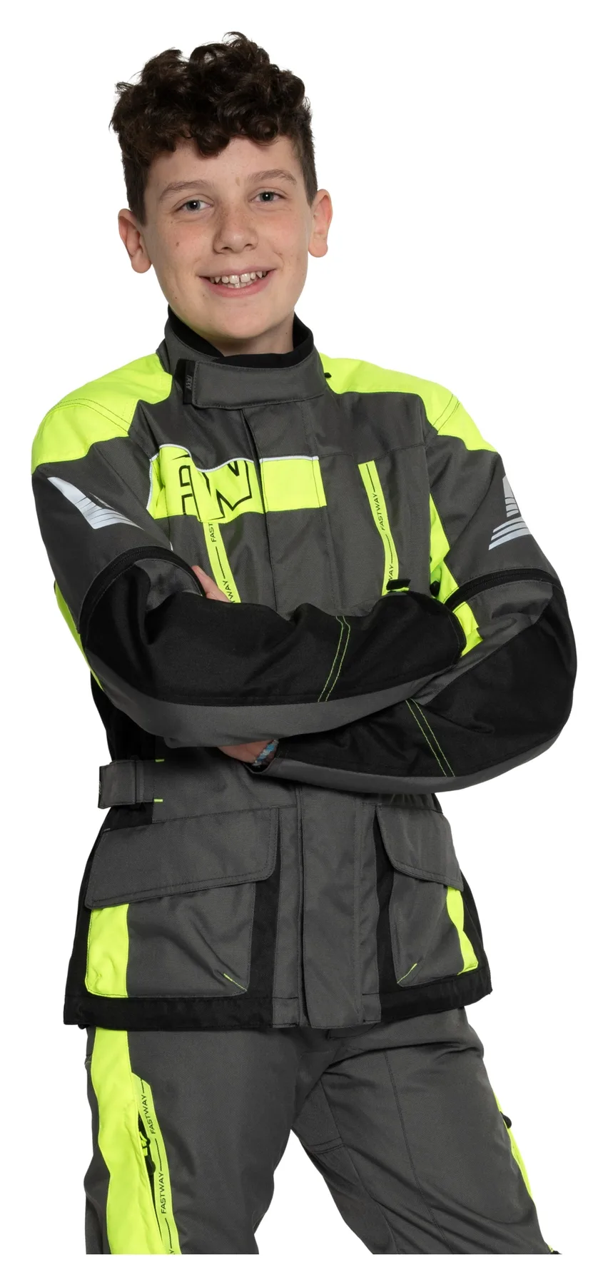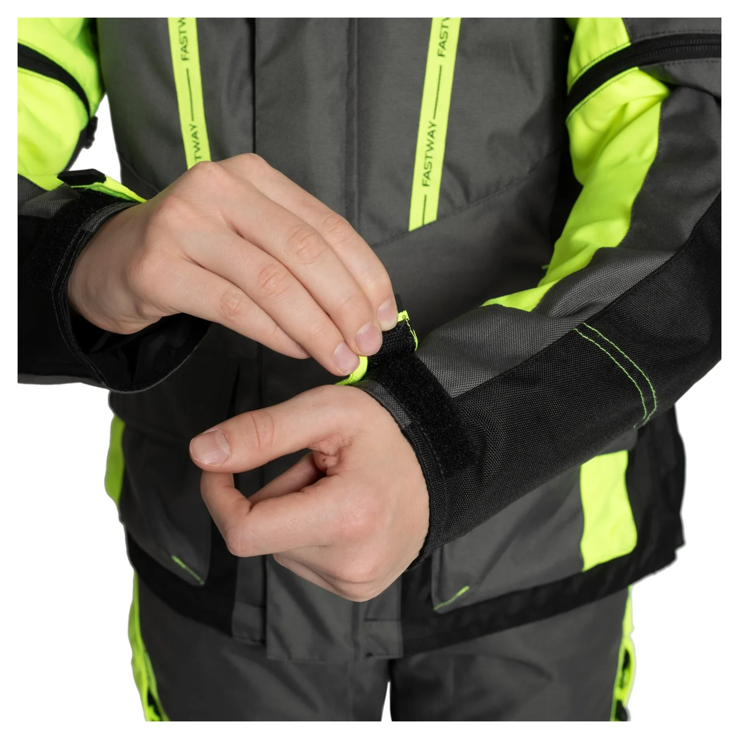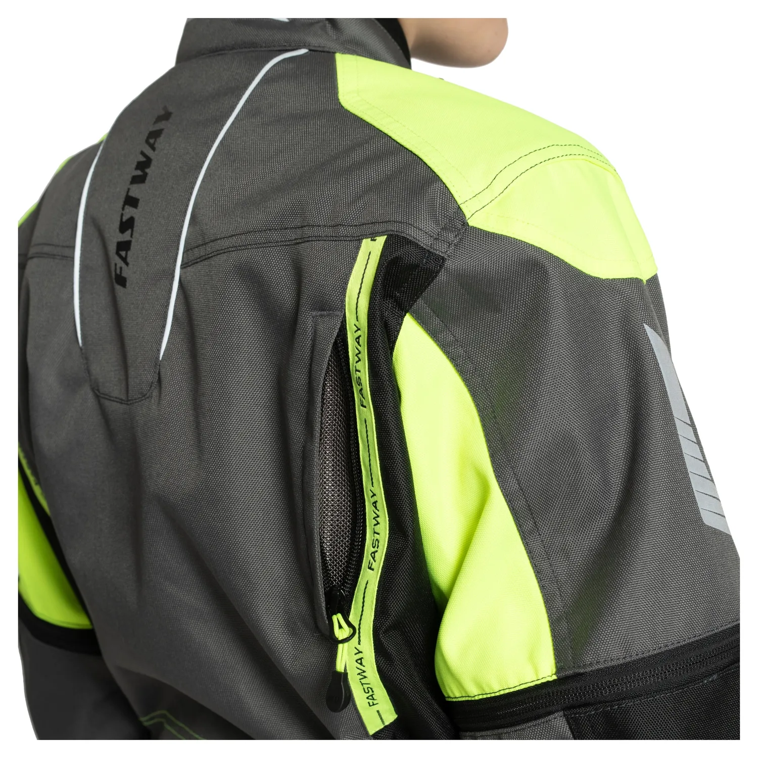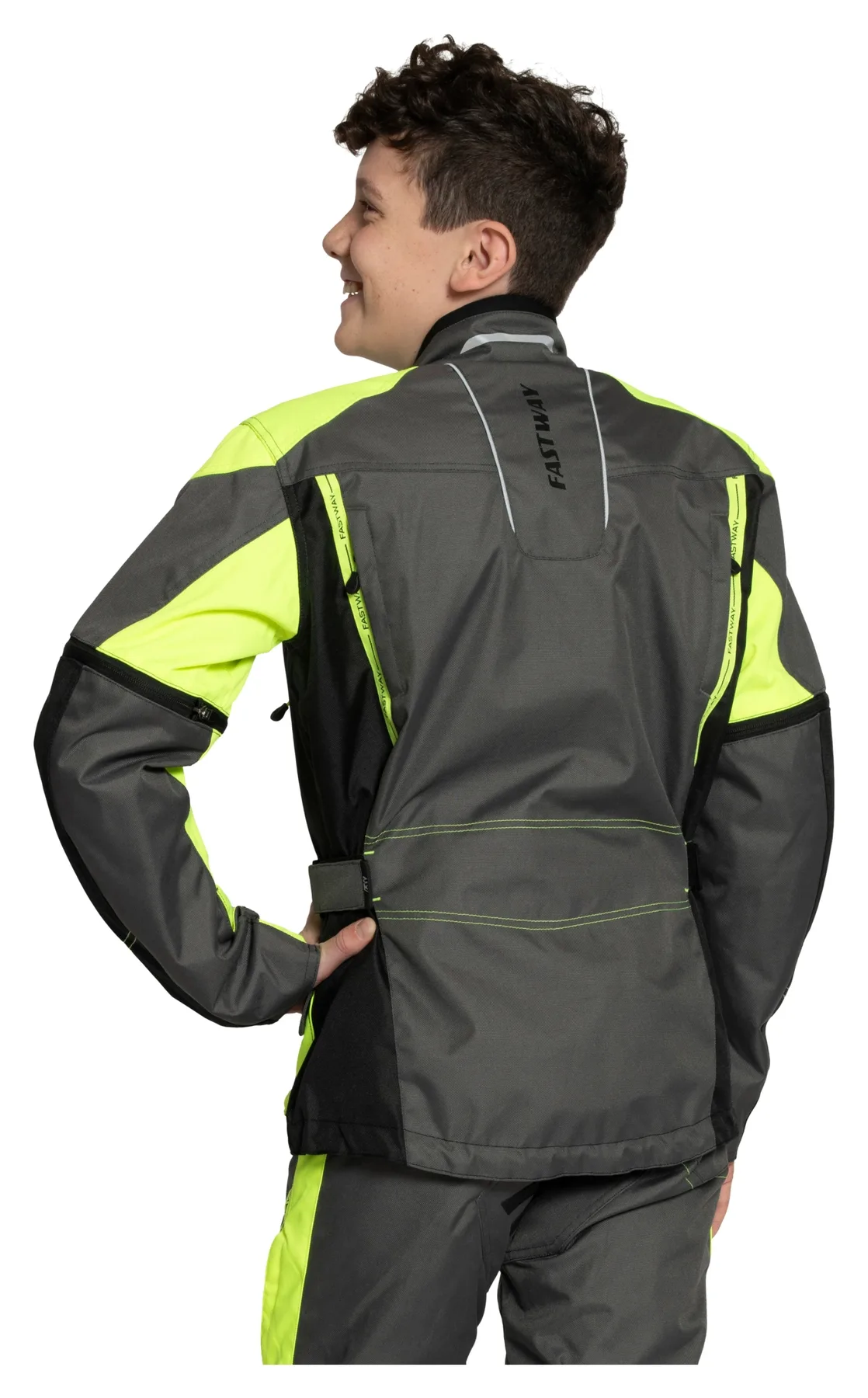 Bei der Fastway *Touring Kids 191* Textiljacke gibt es im Vergleich zu so einer Motorradjacke für Erwachsene eigentlich nur einen Unterschied: die Ärmel wachsen mit. Und zwar bis 4 cm in der Länge. Alles andere an Ausstattungsmerkmalen, an Sicherheit und an Komfort liest sich wie bei den Erwachsenenjacken. Überzeugt euch selbst.