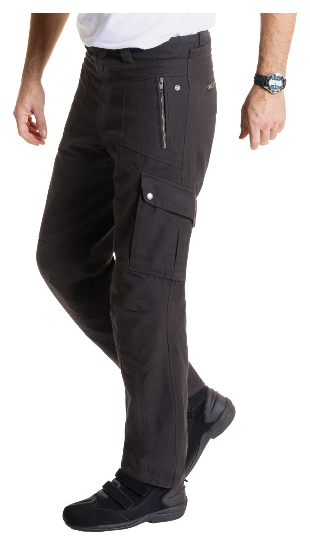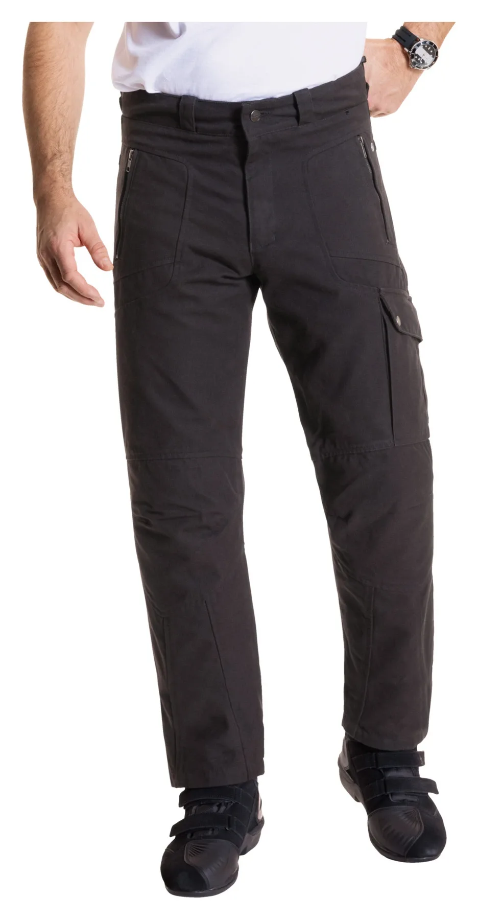 Многие клиенты уже полюбили и продолжают любить текстильные брюки Highway 1 *Cargo II*. Для всех поклонников этих мотоциклетных брюк в повседневном стиле и тех, кто хочет ими стать, Louis предлагает брюки Fastway *T-2207* Cargo. Они изготовлены из высококачественного, плотного и приятного на ощупь холщового материала с арамидными усилениями в области бедер и коленей и имеют характерный карго-вид благодаря накладным карманам на ногах. Брюки Fastway *T-2207* поставляются с защитой SafeTech на коленях (уровень 1). Если вы предпочитаете установить защиту Xelion (уровень 2) (20019094), которая обеспечивает особенно большую свободу движений, пожалуйста. А без защитных элементов Fastway *T-2207* - это просто стильные повседневные брюки.
