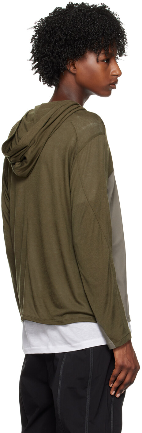 Зеленая толстовка со вставками. Толстовка из легкого лиоцеллового джерси со вставками и эластичного джерси из полиэстера. Двусторонняя молния. Рукава «летучая мышь». Цвет поставщика: оливково-зеленый. Основная часть 1: 100 % лиоцелл. Основная часть 2: 95 % полиэстер, 5 % эластан. Сделано в Южной Корее.