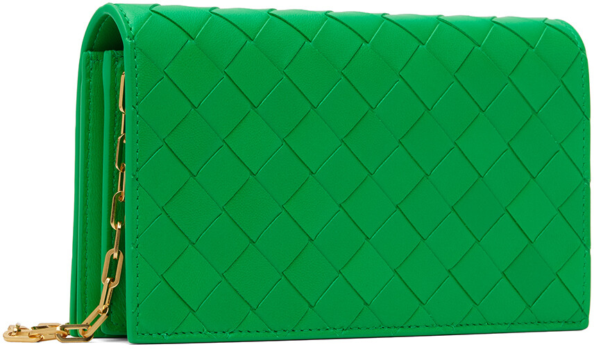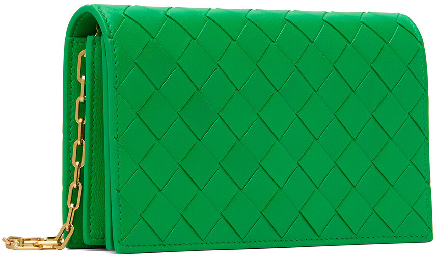 Зеленая мини-сумка. Зелёная сумка на плечо из зернистой кожи ягненка с плетением интреччато. Съемный плечевой ремень из звеньев цепочки Аккордеонная вставка по бокам. Откидной клапан с магнитной застежкой. Два отделения для карт, два отделения и карман на молнии внутри. Золотистая фурнитура H4,5 x W7 x D2 в цвете поставщика: Кожа ягненка цвета попугая. Сделано в Италии.