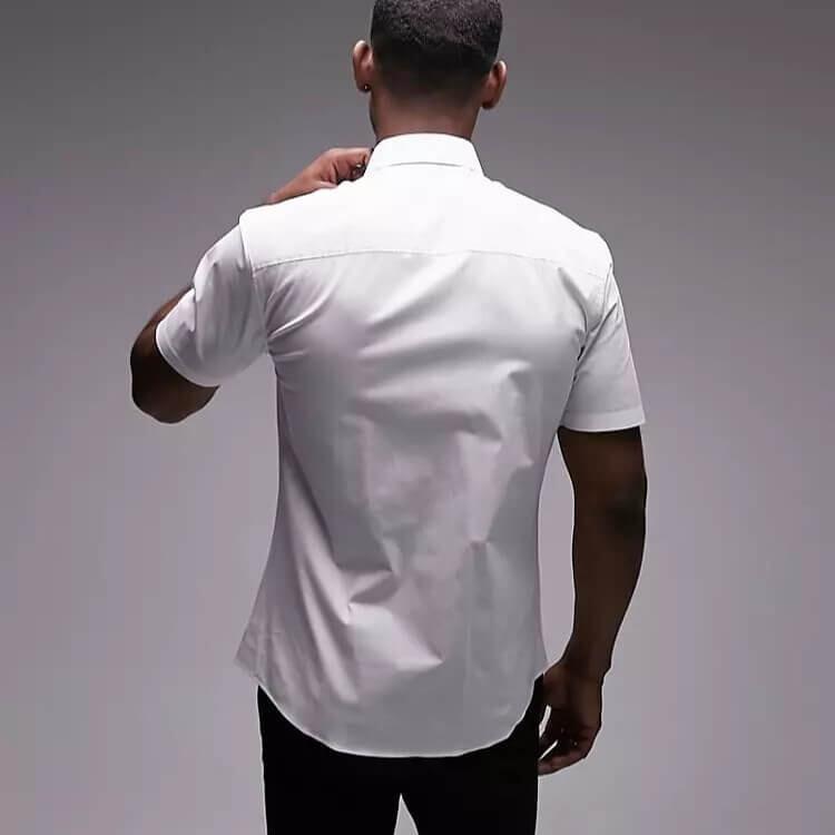 Рубашка с коротким рукавом, классическим воротником и застежками на пуговицы.