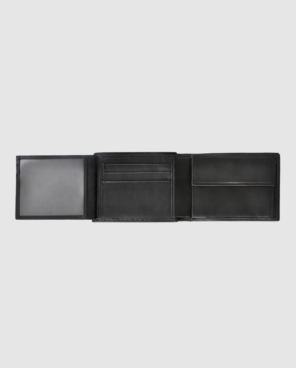 Кошелек в американском стиле черного цвета. Включает окошко для удостоверения личности, пять отделений для кредитных карт и два отдельных отделения для купюр.