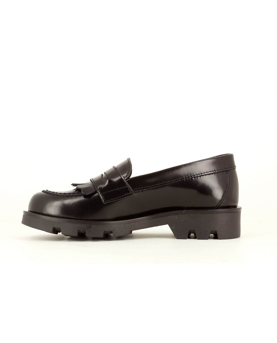 Черные мокасины из бычьей кожи с декором-маской и бахромой в тон. Внутренняя подкладка из дышащего технического текстиля с высокой стойкостью к истиранию для оптимизации температуры стопы Прочность, гибкость и универсальность 100% испанской обуви.