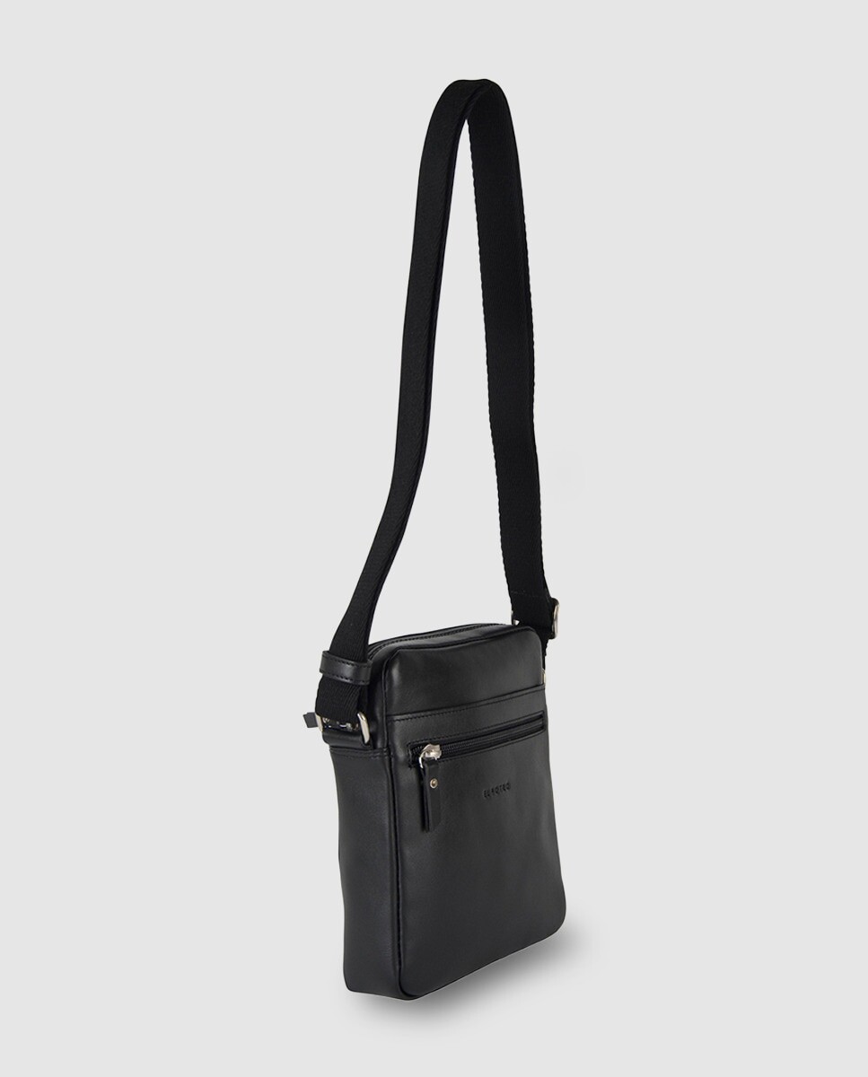 Черная сумка через плечо из коровьей кожи с застежкой-молнией и длинной ручкой. Имеет два внешних кармана: один спереди и один сзади, оба на молнии. Содержит два внутренних кармана.