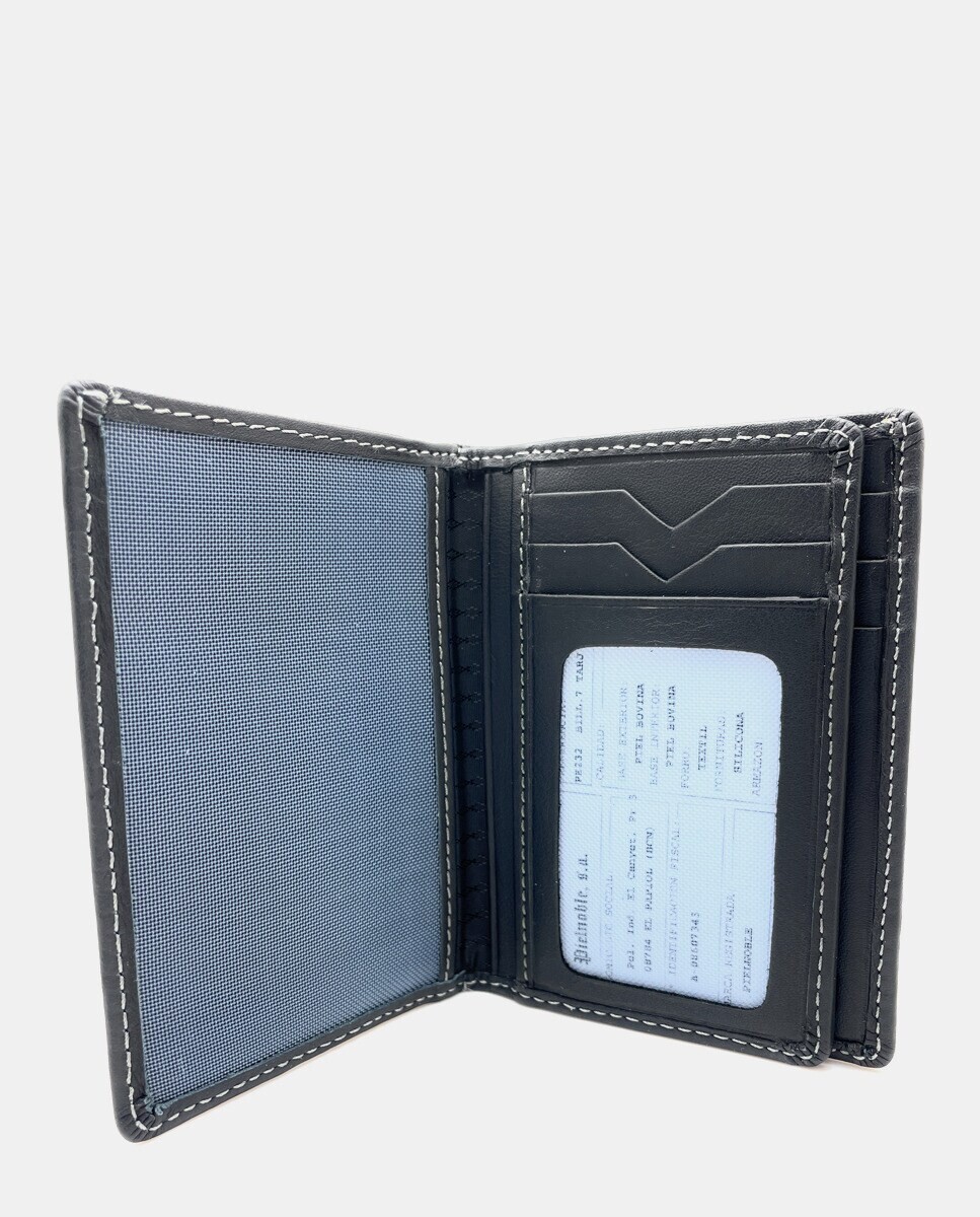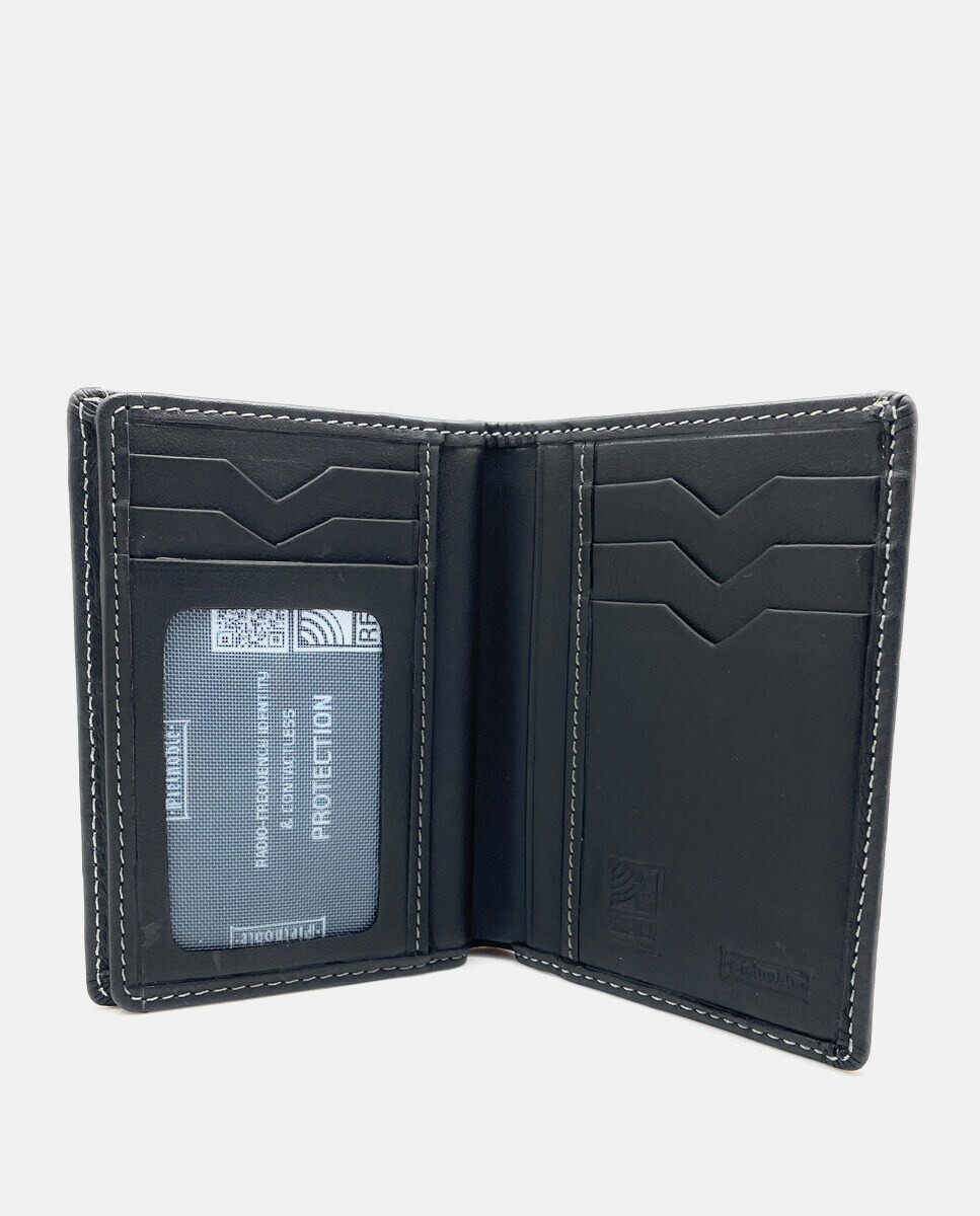 Черный кожаный кошелек с отделениями на семь карт и двойным кошельком внутри. Встроенная защита от копирования карт.