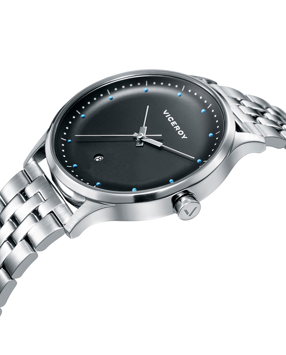 Мужские часы Viceroy Switch с тремя стрелками, стальным корпусом и браслетом, черным циферблатом, синими индексами и календарем в положении «6 часов».