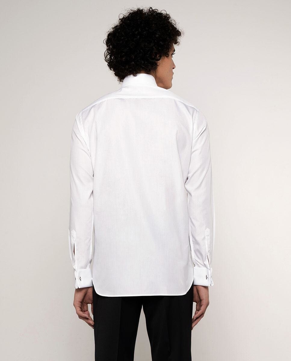 Рубашка-смокинг с воротником-бабочкой, двойными манжетами для запонок и соответствующей отделкой из пике спереди, на воротнике и манжетах. Он имеет петельки на двух передних сторонах, поэтому его можно использовать с индивидуальными пуговицами. Идеально подходит к смокингу или фраку.
